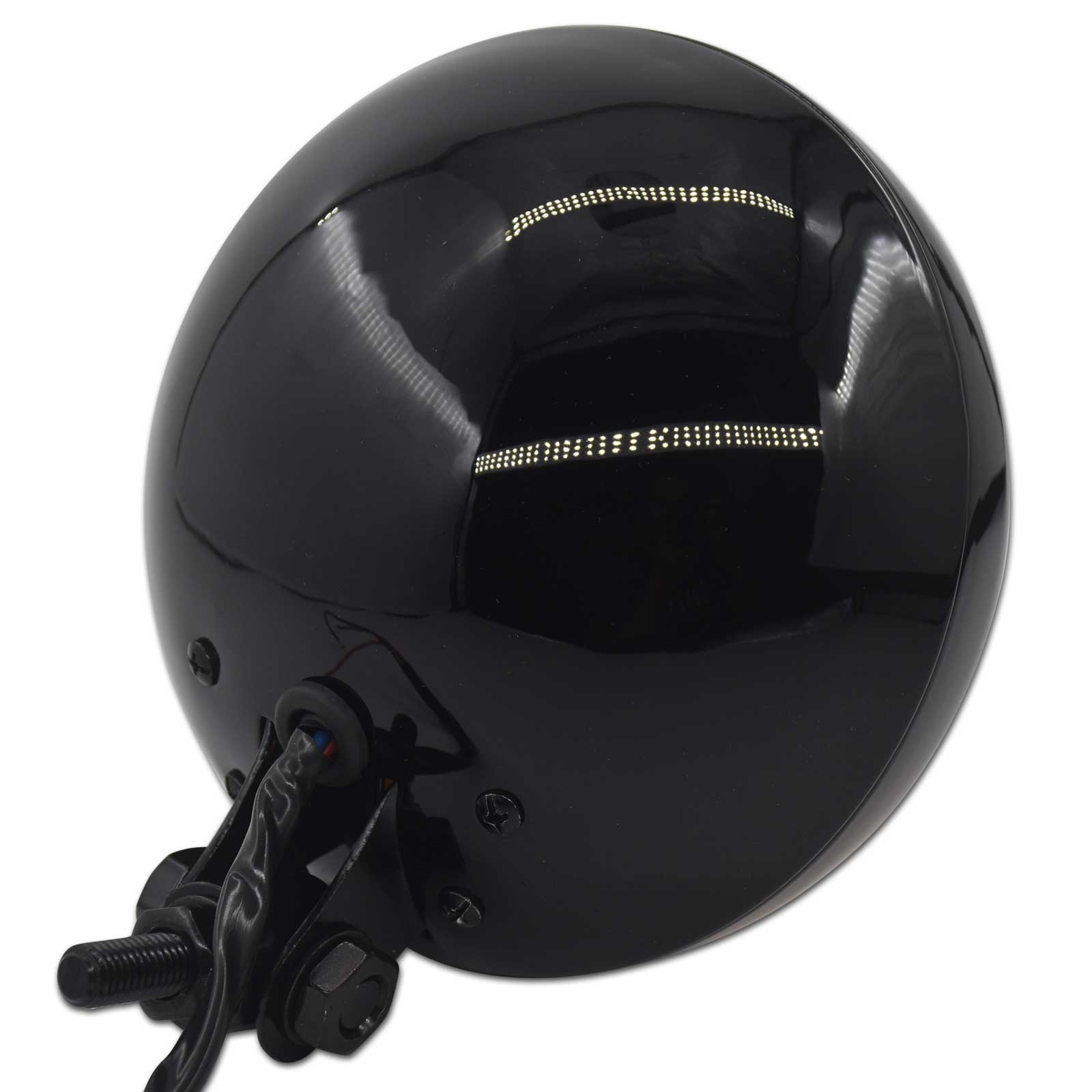 Toller unten montierter Scheinwerfer für Old School Bobber, Cafe Racer und sogar Oldtimer. Funktioniert mit 12V/55W, hat Fern- und Abblendlicht und besteht aus Metall und Glas.