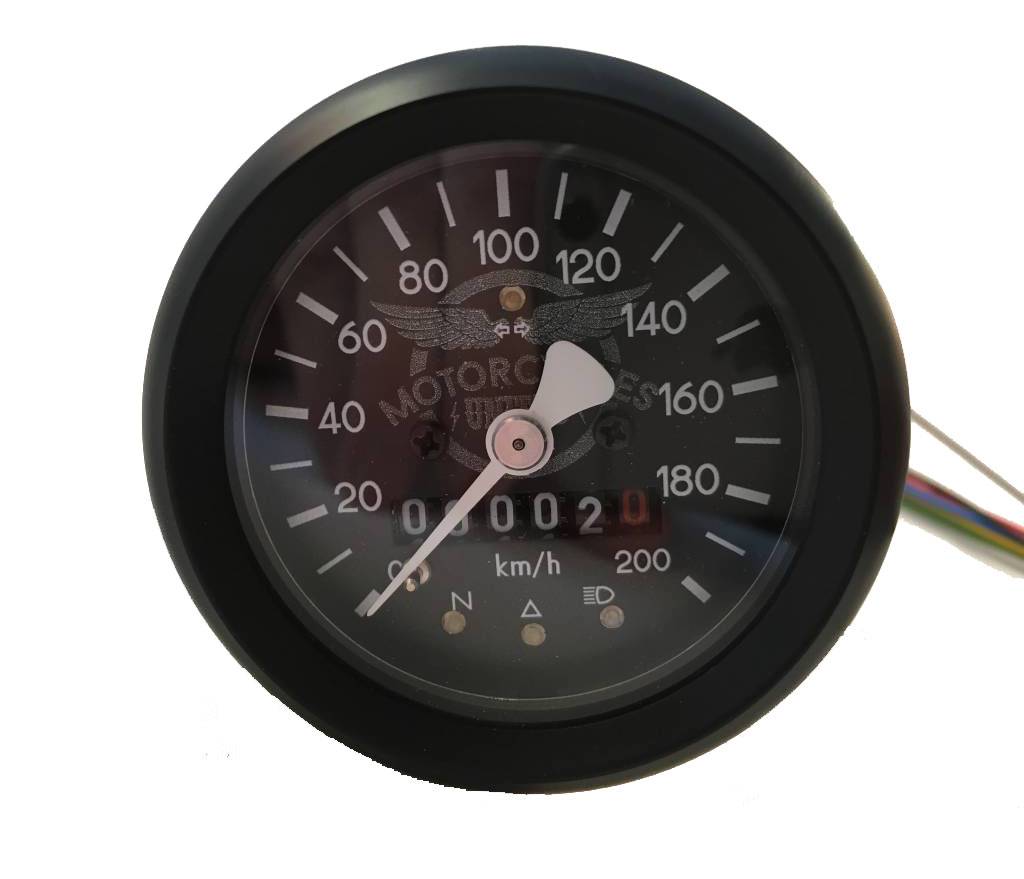 Wenn weniger manchmal mehr ist. Hochwertig verarbeiteter Universaltacho mit schwarzem Metallgehäuse und beleuchtetem schwarzen Ziffernblatt. Für Umbauten wie Scrambler und Flat Tracker bei denen ein spartanisch wirkendes Cockpit im Fordergrund steht, aber dennoch stilecht wirken soll. Der Gewindedurchmesser der Tachowellenaufnahme beträgt 18MM.