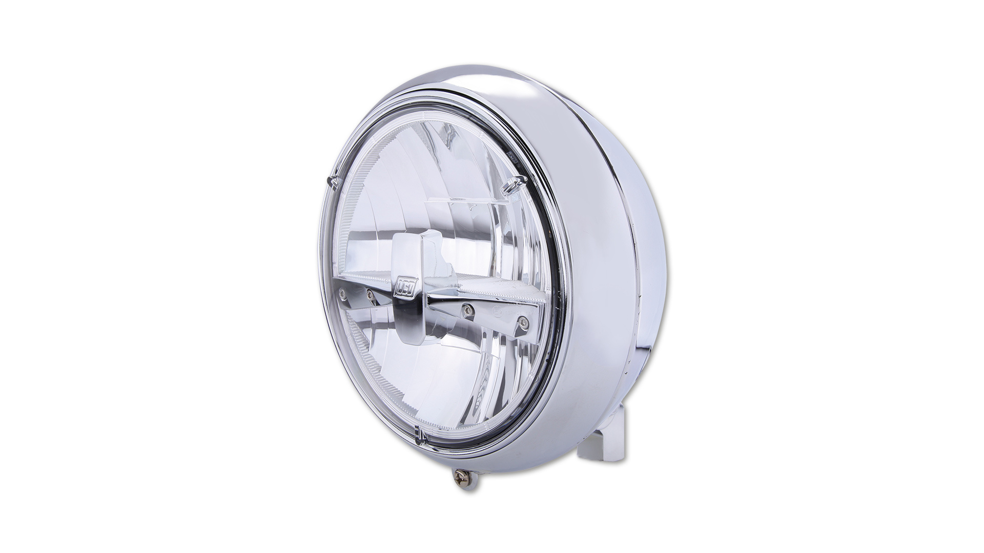HIGHSIDER 7-Zoll-LED-Scheinwerfer YUMA 2 TYPE 3, verchromter innovativer Power-LED-Scheinwerfer mit Klarglas-, Fernlicht-, Abblend- und Standlichtfunktion. Die Besonderheit des sperrigen 7-Zoll-Hauptscheinwerfers ist die LED-Lichttechnologie im Inneren und die untere Halterung, mit der Sie den Scheinwerfer drehen können, indem Sie ihn näher oder weiter vom zu montierenden Lenkkopf wegbewegen. Im oberen Teil des Scheinwerfers leuchtet das Abblendlicht auf und mit