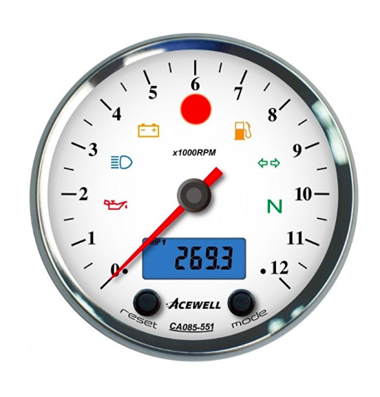 Sehr kompletter Drehzahlmesser von Acewell. Hat eine verchromte Lünette und ein weißes Zifferblatt. Er ist sowohl ein Kilometerzähler als auch ein Drehzahlmesser. Der Drehzahlmesser ist analog und der Kilometerzähler ist digital.