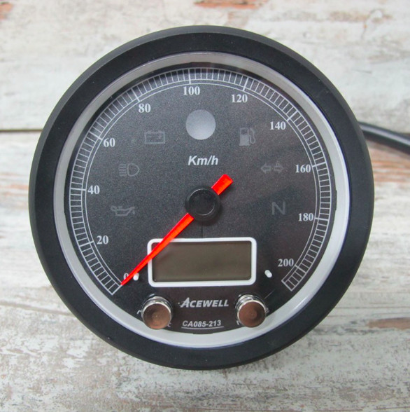 Sehr vollständiger Acewell-Tachometer. Ausgestattet mit schwarzer Lünette und schwarzem Zifferblatt. Darüber hinaus verfügt er über die Funktionen Kilometerzähler und Tachometer. Der Drehzahlmesser ist analog und der Kilometerzähler ist digital.