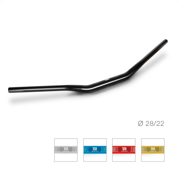 - Ergal stellt den Lenker mit verschiedenen Abschnitten her. Der letzte Teil des Lenkers hat einen Durchmesser von 22 mm und einen Durchmesser von 28,6 mm in der Mitte (zu den Handgriffen).