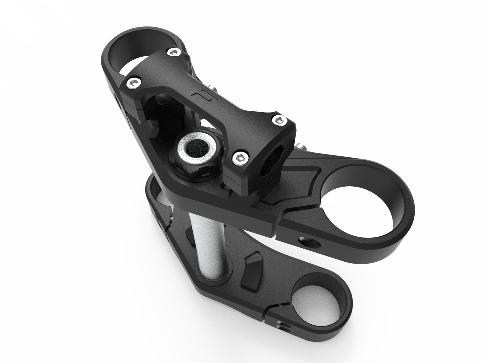 • Vollaluminium-Dreifachbaum, schwarz oder silber eloxiert, mit einstellbaren Lenkanschlägen und Halterung für Bremsleitungssplitter
