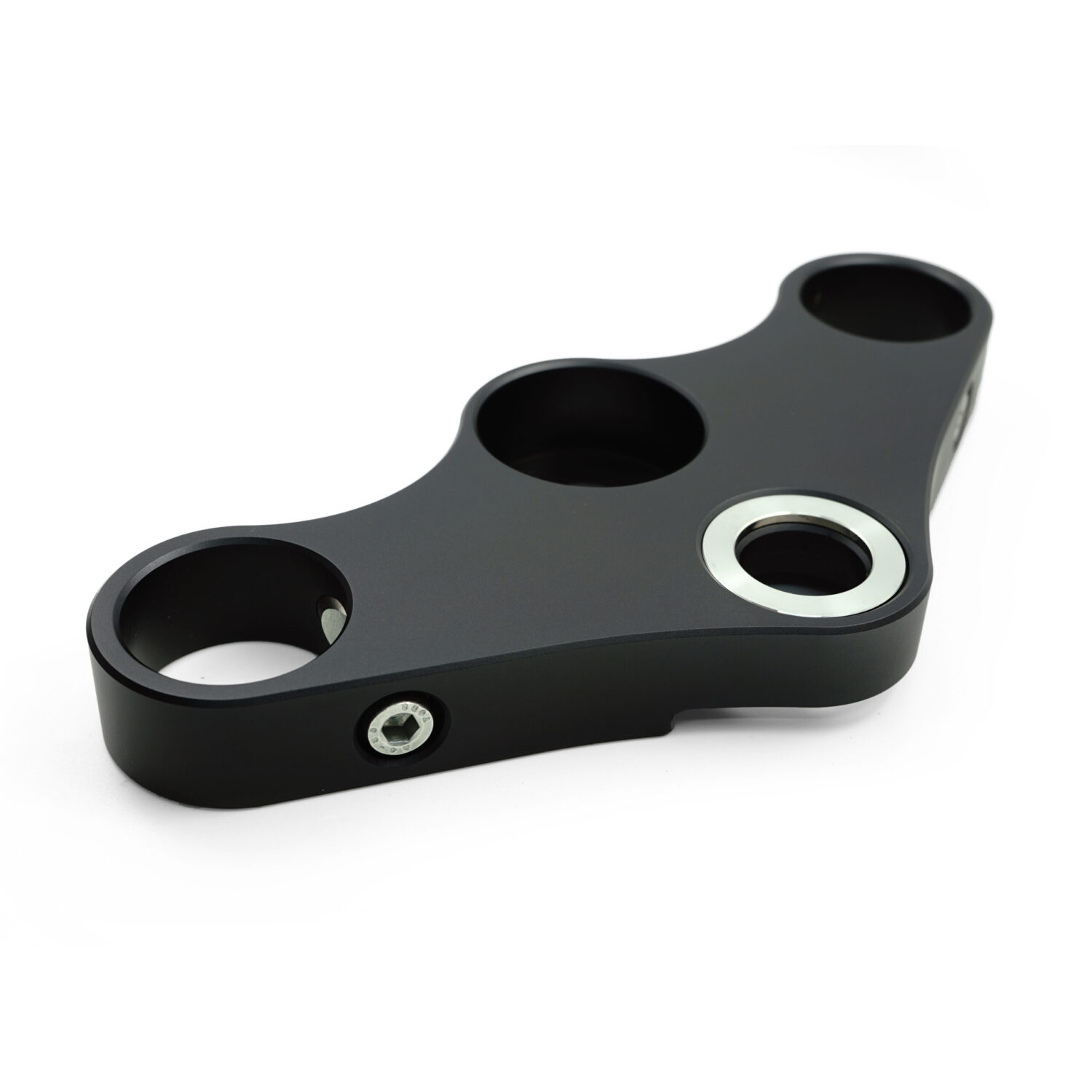 Diese hochwertige Gabelbrücke ist aus einem Stück Flugzeugaluminium CNC-gefräst. Nach der Bearbeitung durchläuft die Gabelbrücke eine Reihe von Oberflächenbehandlungsschritten, einschließlich Eloxieren. Das Ergebnis ist ein glattes Satin-Finish, das sowohl kratz- als auch witterungsbeständig ist. Vervollkommnen Sie für einen Caférennfahrer-Motorradbau oder irgendeinen anderen kundenspezifischen Bau, in dem Sie Klipp-auf verwenden möchten.