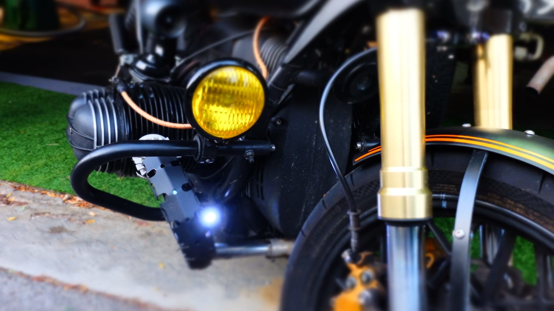- Panzer von BMW R45 mit einem sehr seltenen Werkzeugkasten. Deckel mit Kohle umwickelt und mit transparentem Fenster. (um einen Navigator zu sehen) Darunter befindet sich eine USB-Buchse mit einem Kabel, das zum Aufladen des Smartphones in den Deckel kommt.