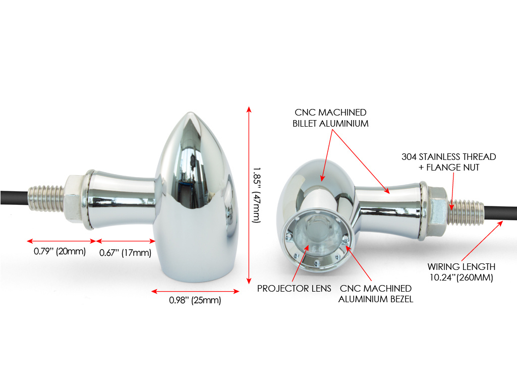 Diese hochwertigen Indikatoren sind aus massivem 6061 Billet Aluminium gefertigt. Intern verfügen sie über einen sehr hellen, leistungsstarken, gelben CREE-LED-Chip mit einer Projektorlinse. Sie sind auch sehr klein und diskret und werden wählerischen Käufern auf der Suche nach hochwertigen Indikatoren zu einem erschwinglichen Preis.