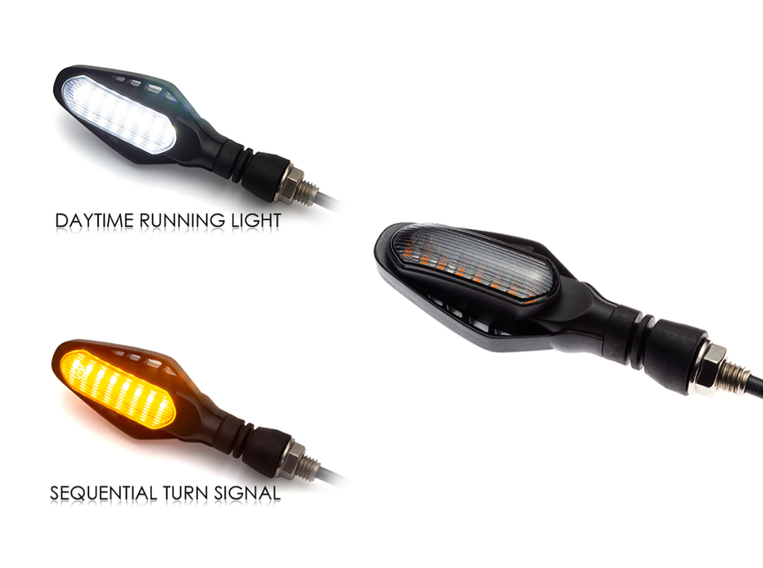 Diese integrierten LED-Blinker kombinieren Blinker- und Tagfahrlichtfunktionen, die für die Vorderseite Ihres Motorrads benötigt werden. LEDs ändern ihre Farbe zwischen den Funktionen - Gelbe LED für Blinker und Weiß für Tagfahrlicht.