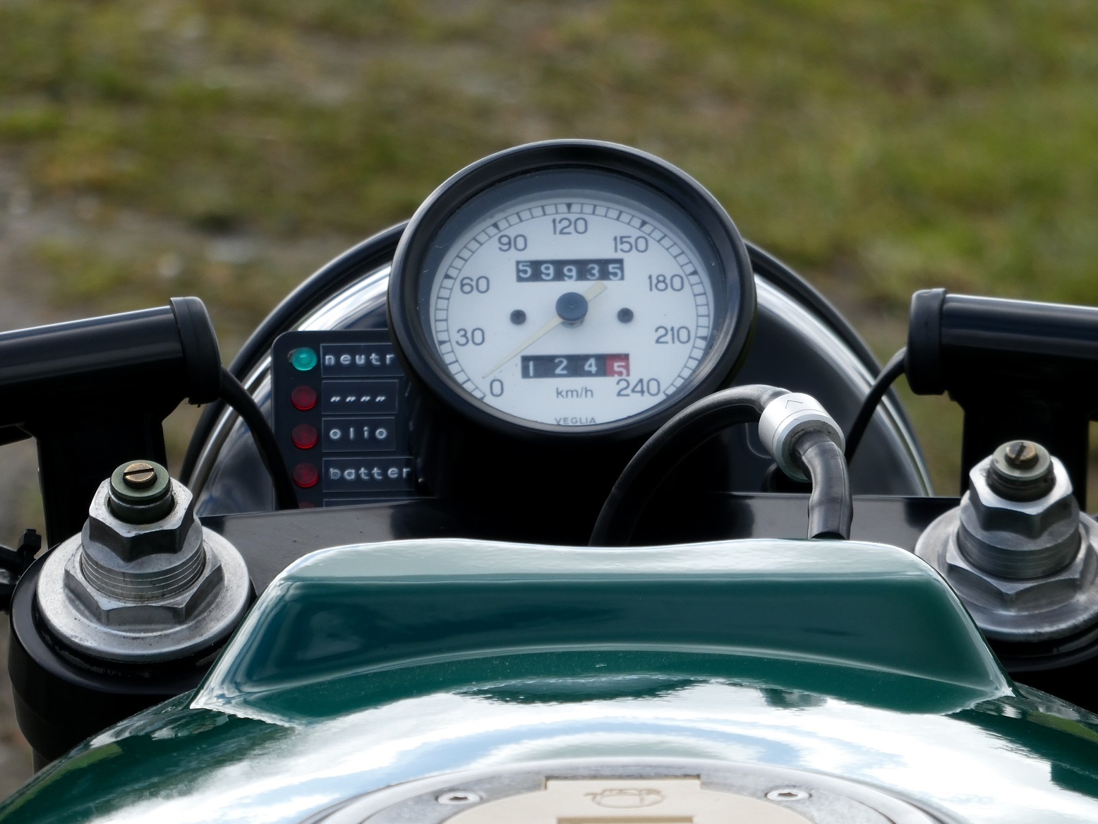 Das Armaturenbrett besteht aus dem originalen Kilometerzähler und zusätzlich LED-Warnleuchten an der Vorderseite; Neutralleiter, Öldruck und Batterieladung. (Ersatzbenzinleuchte leuchtet ständig)