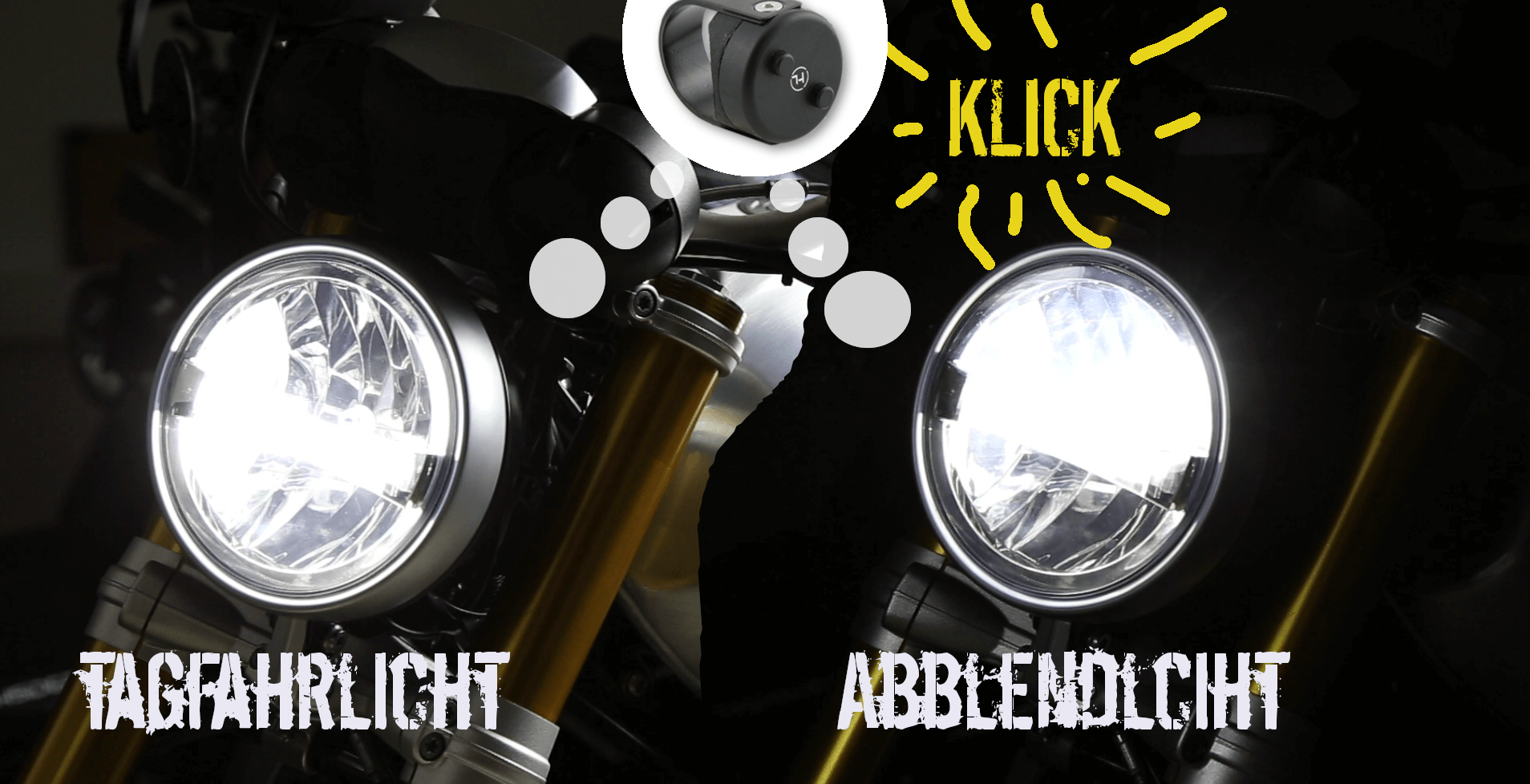 Der HIGHSIDER E-BOX DRL TOUCH kann mit einem Druckschalter (nicht im Lieferumfang enthalten) umgeschaltet werden, der das Abblendlicht ein- oder ausschaltet.