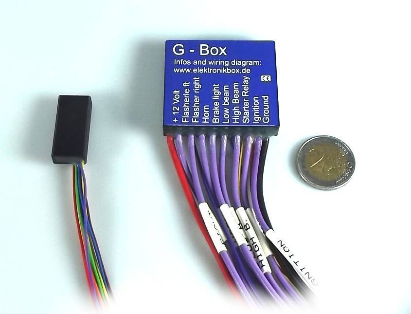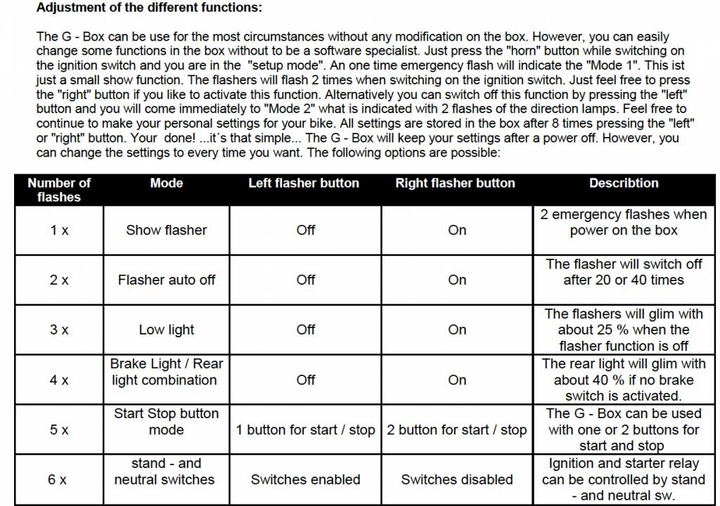 Diese Elektronikbox ist wahlweise mit 1 Lenkeradapter (G) oder 2 Lenkeradaptern (G2) erhältlich. Sie steuert die wichtigsten elektrischen Funktionen Ihres Motorrads über Drucktasten. Die Elektronikbox bietet folgende Funktionen: