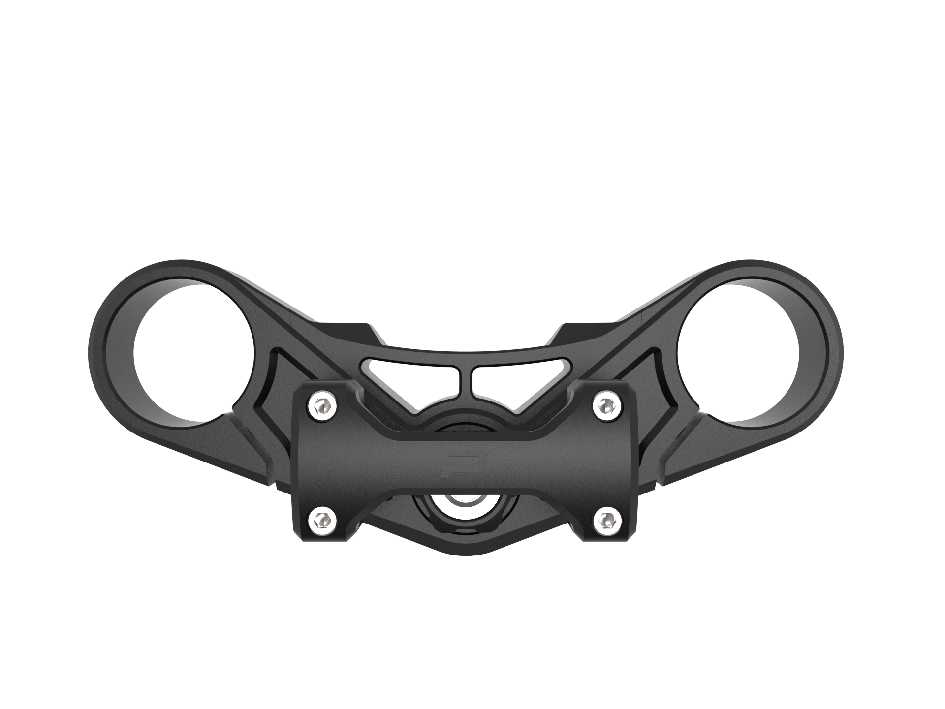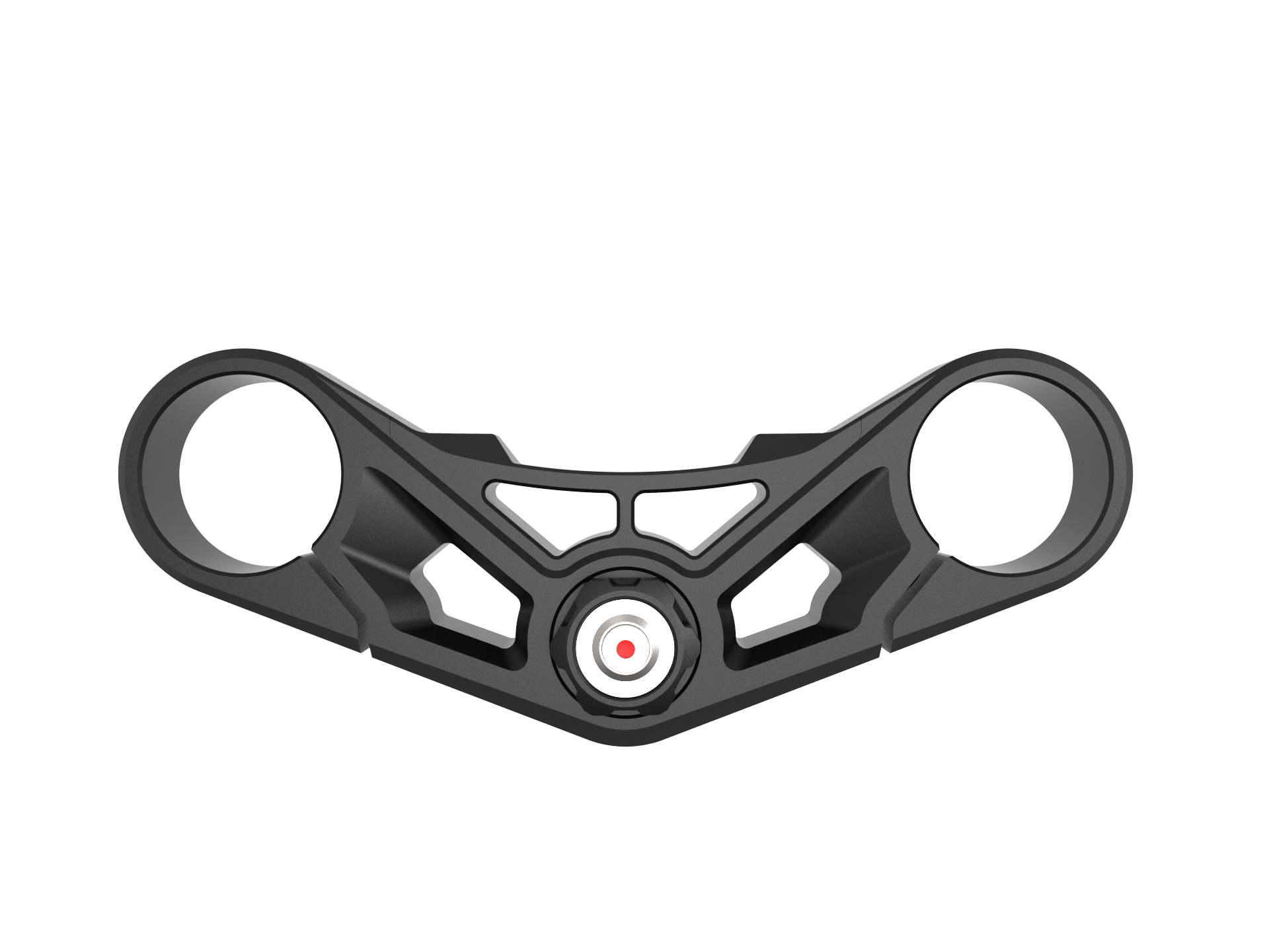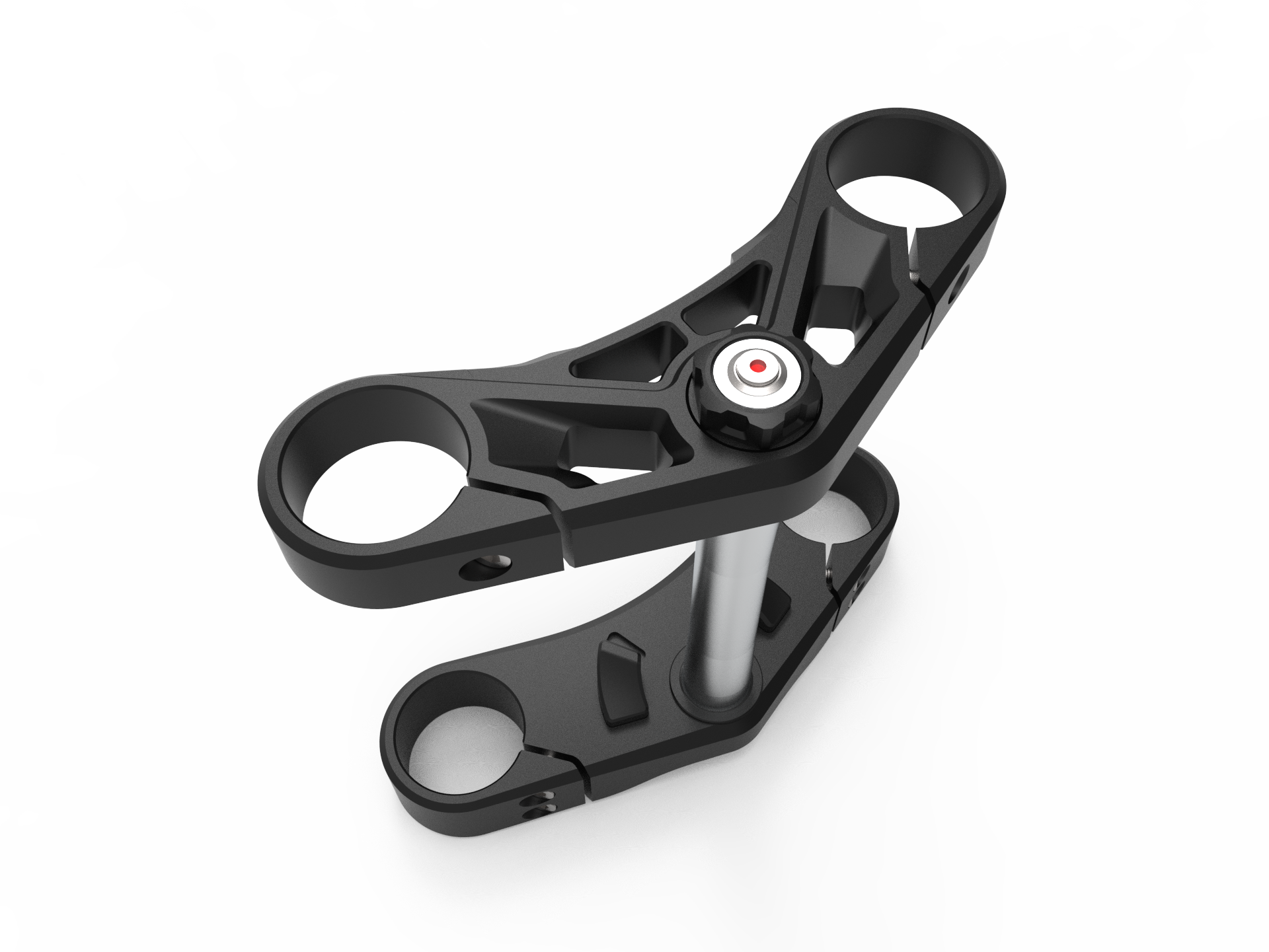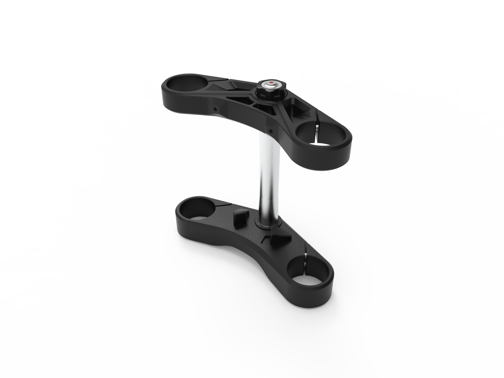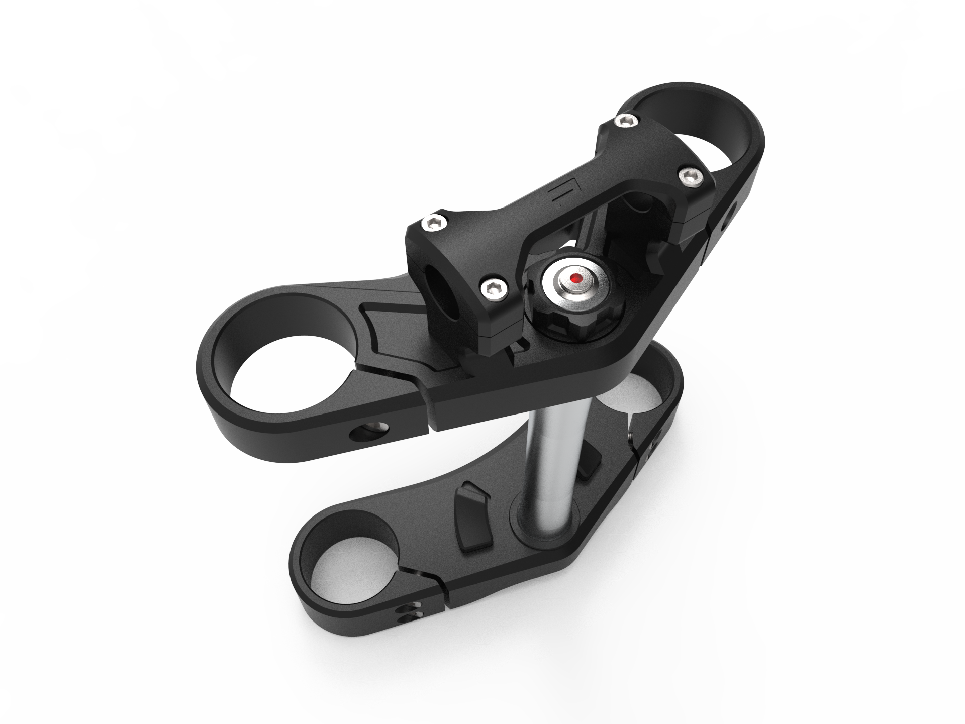 - Vollaluminium-Gabelbrücke schwarz eloxiert mit verstellbaren Lenkanschlägen und Aufnahme für Bremsleitungssplitter