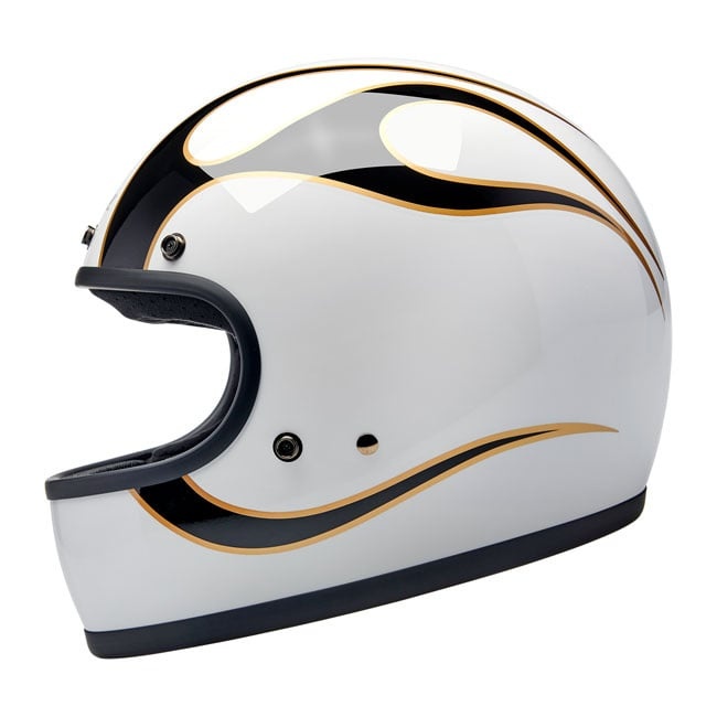 Der Biltwell Gringo aktualisiert den Rennstil der 60er Jahre, um die DOT- und ECE R22.06-Motorradvorschriften zu erfüllen. Die Außenschale aus spritzgegossenem ABS ist stabil, aber leicht und hat wunderschöne handgemalte Farben, Schweiß wird von gebürsteten Fleece-Lycra-Kontaktpunkten auf dem austauschbaren/abnehmbaren Komfortfutter und den Wangenpolstern absorbiert und verdunstet, außerdem gibt es zwei D-Ring-Kinnriemen und Aussparungen für die Gegensprechanlage.