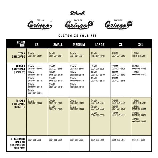 Biltwell bietet herausnehmbare Wangenpolster für Ihre ECE-zertifizierten Helme R22.06 Gringo, Gringo S und Gringo SV an. So können Sie alte, verschmutzte Polster austauschen oder den Tragekomfort je nach Vorliebe mit dünneren oder dickeren Polstern individuell anpassen.
