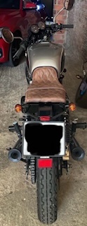 Zweisitzer, maßgefertigte Ledersitzbank, neue Reifen, frisch gewartet und aufgetankt. Heizgriffe, neue Scheinwerfer, Rücklichter und Blinker, neue HAGON-Stoßdämpfer, ein Honda CB 650-Tank von 1975, ein modifizierter Tachometer, Stummellenker und ein seitlich am Motorrad montiertes Zündschloss.
