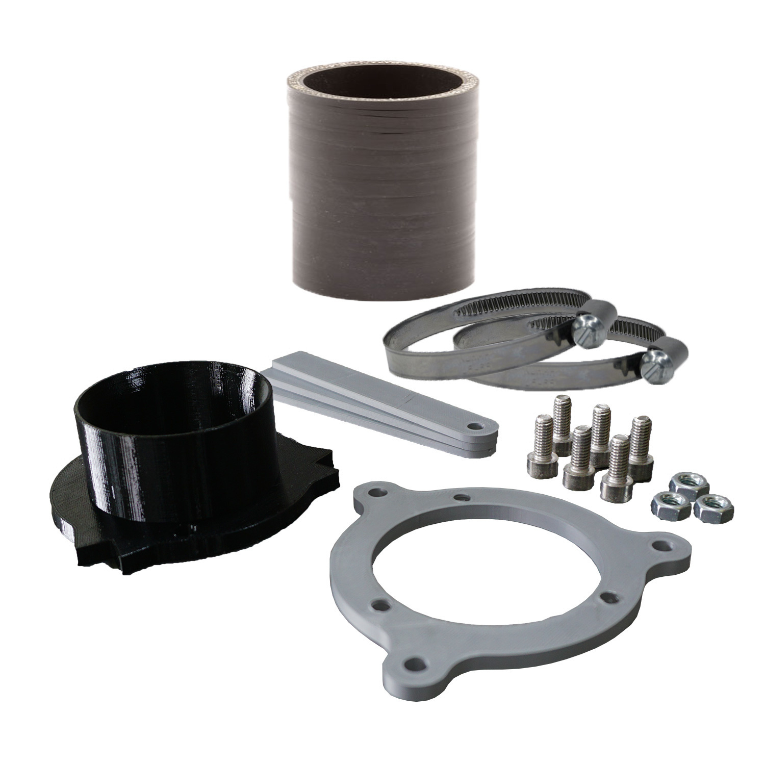 Das universelle Adapterset ist für 51, 54, 57 und 60 mm Innendurchmesser ausgelegt und wird mit einem 80 mm langen Schlauch geliefert, der auf die gewünschte Länge gekürzt werden kann. Indem Sie die 3 mm dicken Edelstahlhalterungen in die gewünschte Form biegen, können Sie den Hypercharger an stabilen Punkten montieren, sodass das Gewicht des Hyperchargers nicht auf den Adapter, den Schlauch oder den Vergaser fällt.