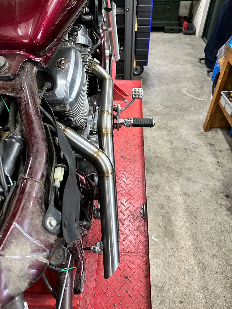 Raw Metal Racers fertigt für jedes Motorrad maßgeschneiderte Auspuffanlagen komplett aus Edelstahl und produziert auch Auspuffanlagen, wie diesen großartig aussehenden VT600/VLX-Auspuff.