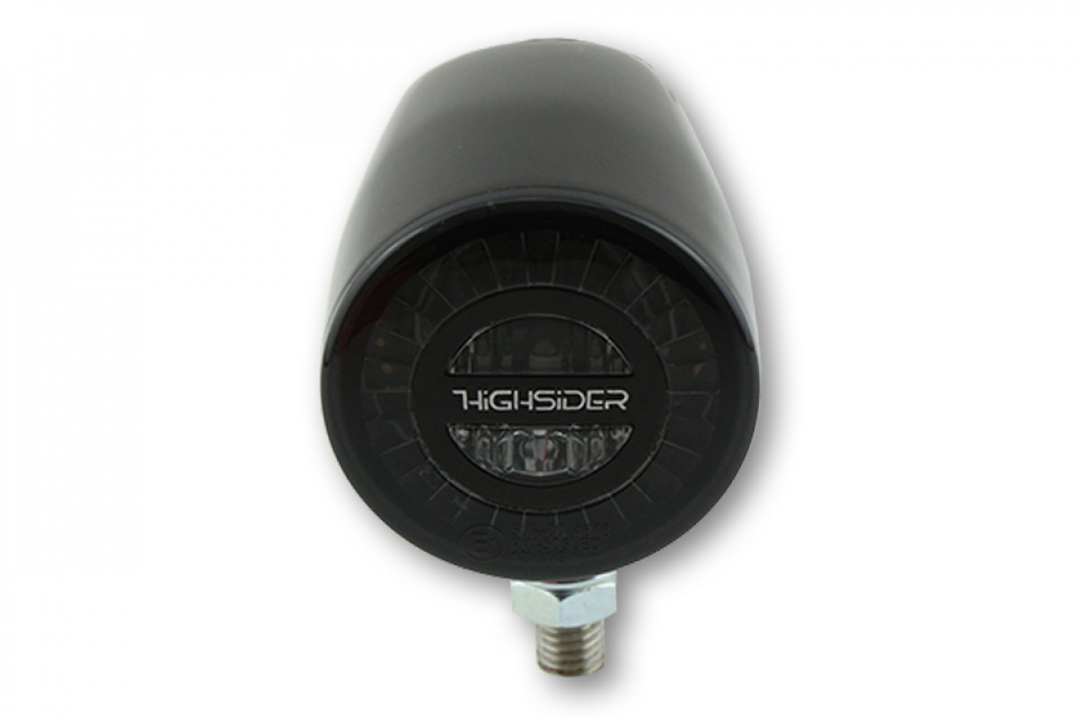 HIGHSIDER ROCKET CLASSIC LED-Rückleuchte mit Aluminiumgehäuse und getöntem Glas, für rückwärtige E-Prüfung.