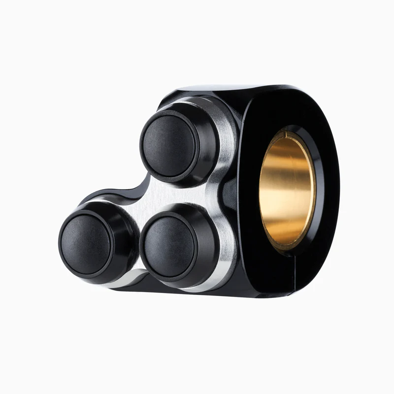 Das aus Billet-Aluminium CNC-gefräste Gehäuse ist schwarz glänzend eloxiert. Optional ist die Tasterarmatur auch mit einer silber eloxierten Tasterplatte erhältlich. Das kompakte Gehäuse ist wahlweise mit zwei oder drei Einzeltastern bestückt. Alle Tasten sind stets auf den Fahrer ausgerichtet.