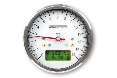 Das Motoscope classic von Motogadget ist ein digitales Multifunktionsinstrument im klassischen Rundgehäuse. Ein weißes Zifferblatt und ein roter Zeiger, angetrieben von einem Präzisions-Schrittmotor, bilden den analogen Drehzahlmesser. Das LC-Display und vier Kontroll-LEDs zeigen die zahlreichen Funktionen präzise und zuverlässig an.