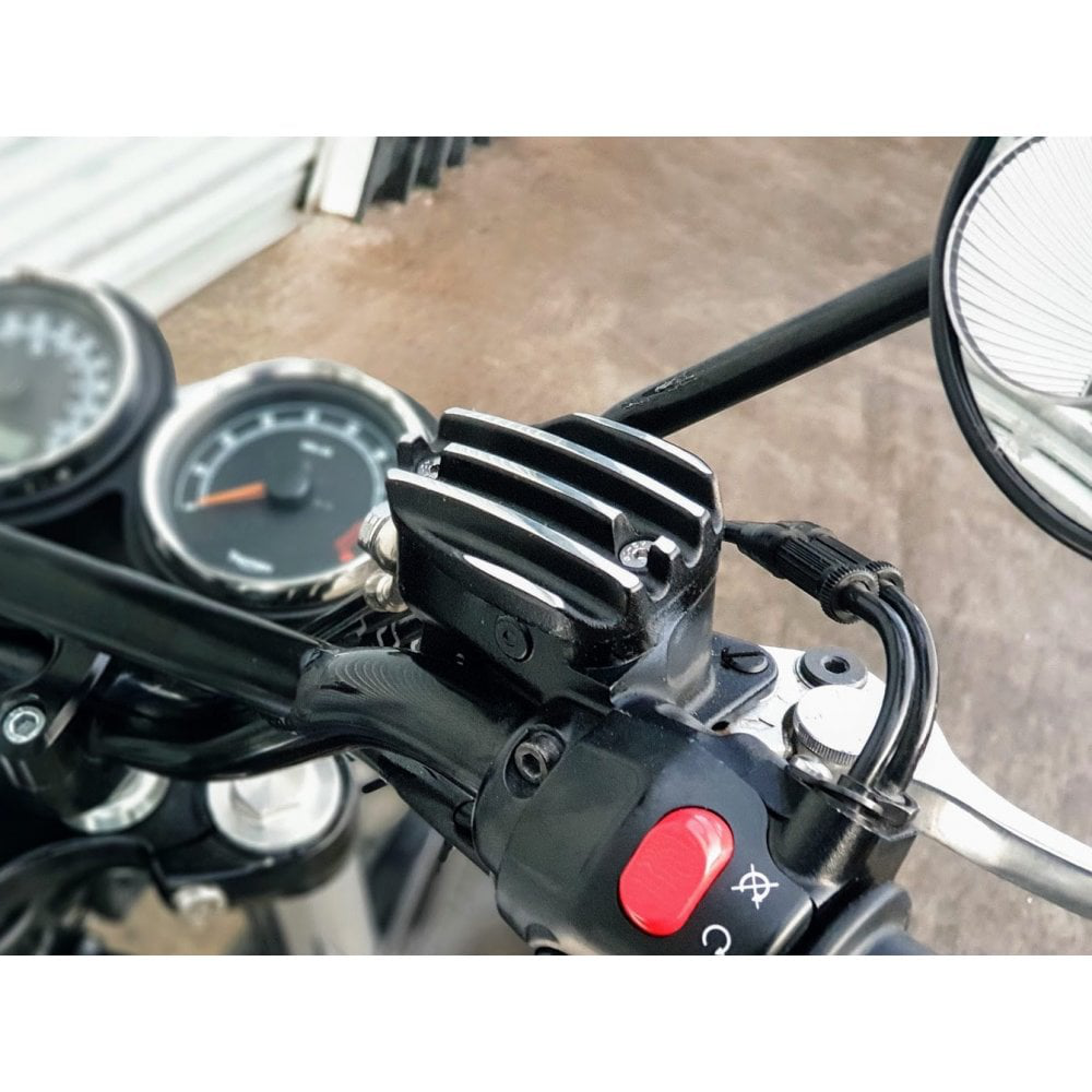 Motone Pressure Cast Disc Brake Oil Reservoir Master Cylinder Cap besteht aus druckgegossenem Aluminium mit einem von den 1970er Jahren inspirierten Rippendeckel.
