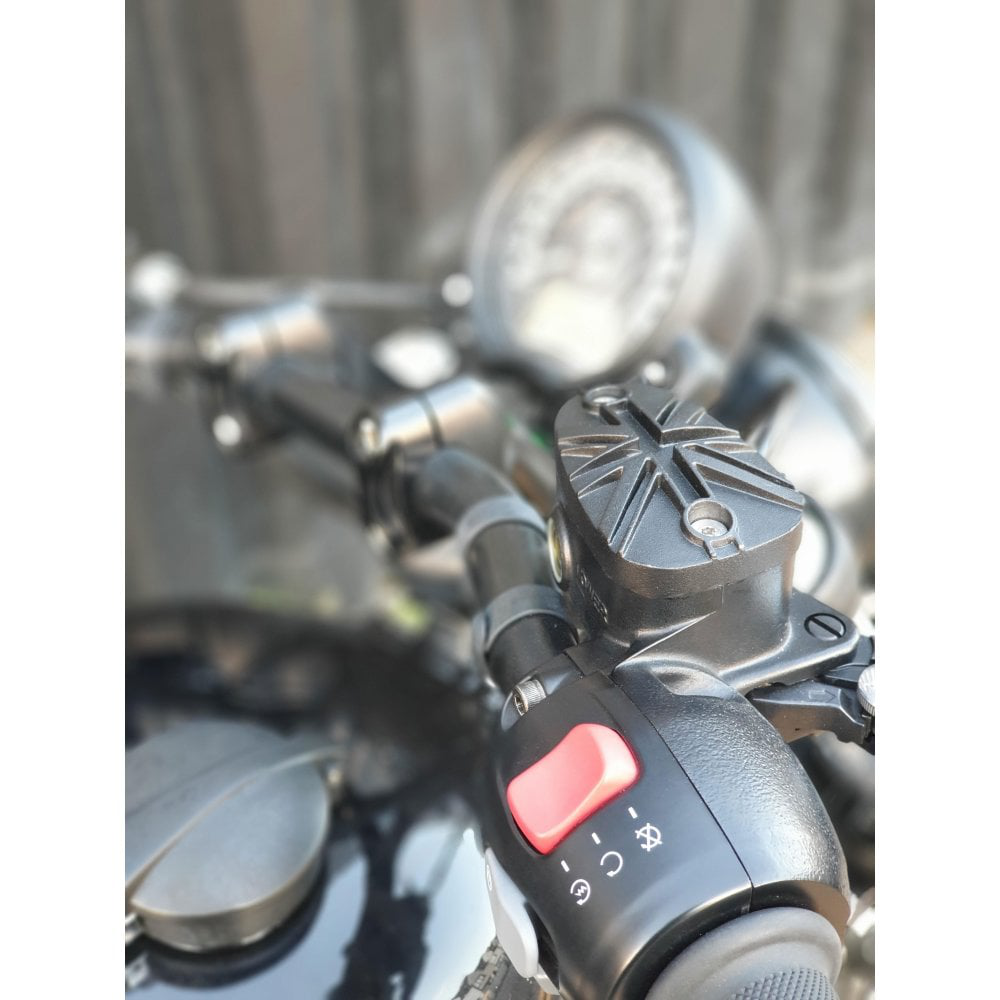 Der Motone Druckguss-Hauptzylinderdeckel für Scheibenbremsen besteht aus druckgegossenem Aluminium mit einem gewölbten, gerippten Union Jack-Muster oder Union Jack-Kontrastpolitur.