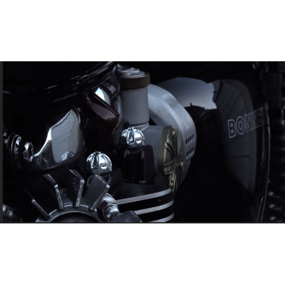 Motone Cylinder Stud Knuckles Caps werden in Sätzen von vier Stück angeboten und sind kaltgeschmiedete Aluminiumknüppel. Um sie am Kopf der Zylinderbolzen oben am Zylinder zu befestigen, werden Griffmuttern und ein Alanschlüssel mitgeliefert.