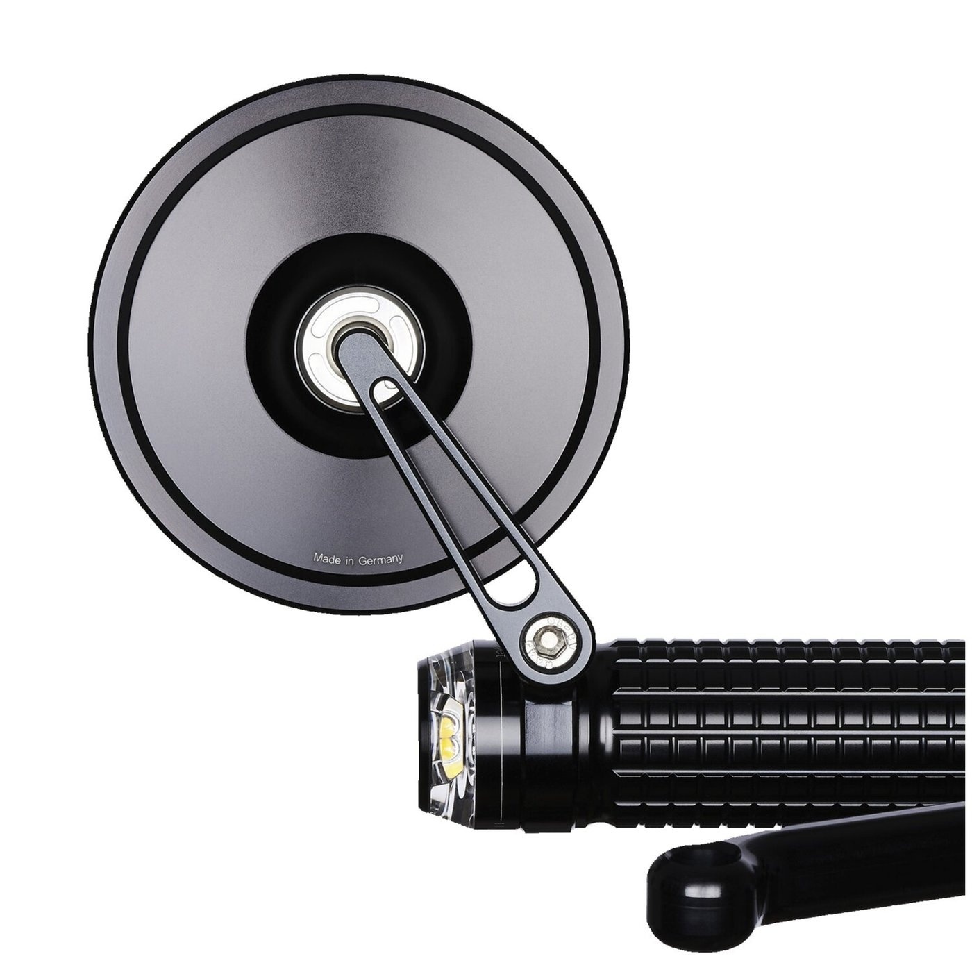 Spiegelkörper, Spiegelarm und die Lenkerklemmen werden auf CNC-Maschinen aus massivem Aluminium gefräst und hochwertig eloxiert. Alle Schrauben bestehen aus Edelstahl. Das präzise Kugelgelenk ermöglicht eine komfortable und sehr stabile Justierung des Spiegels.