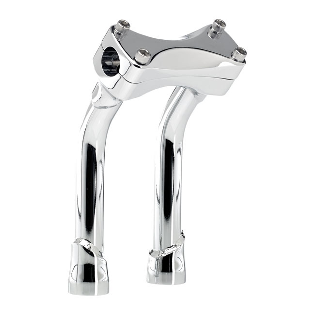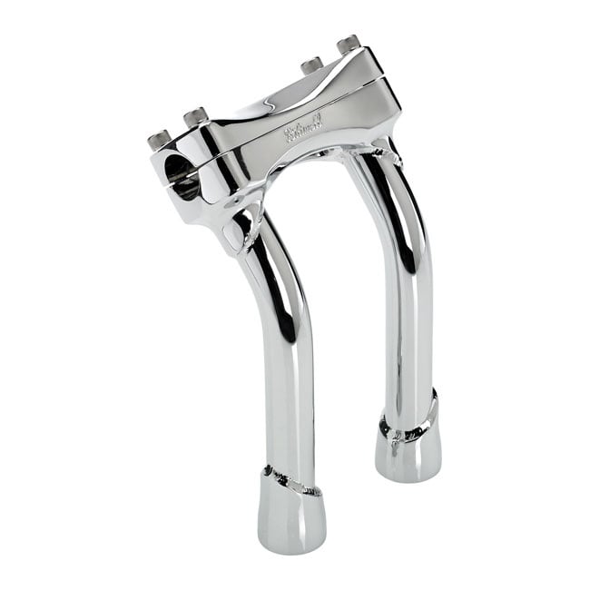 Verchromt/Schwarz. TÜV-geprüft. Mit 2" (5,1cm) Rückzug. Für 1" (25,4mm) Lenker. Hergestellt aus Feinguss Stahl oben & unten mit Gewinde. Die Riser-Rohre sind TIG-geschweißt und bestehen aus nahtlosem 4130-Chromoly mit 3 mm dicken Rohren und 1/2-13-Gewindebohrungen für die Aufnahme von Serien-Riser-Bolzen. Der Abstand beträgt 3-1/2" (89mm), passend für die meisten H-D Gabelbrücken. Das obere Klemmbolzenmuster nimmt die serienmäßigen H-D Tacho- und Drehzahlmesserhalterungen auf.