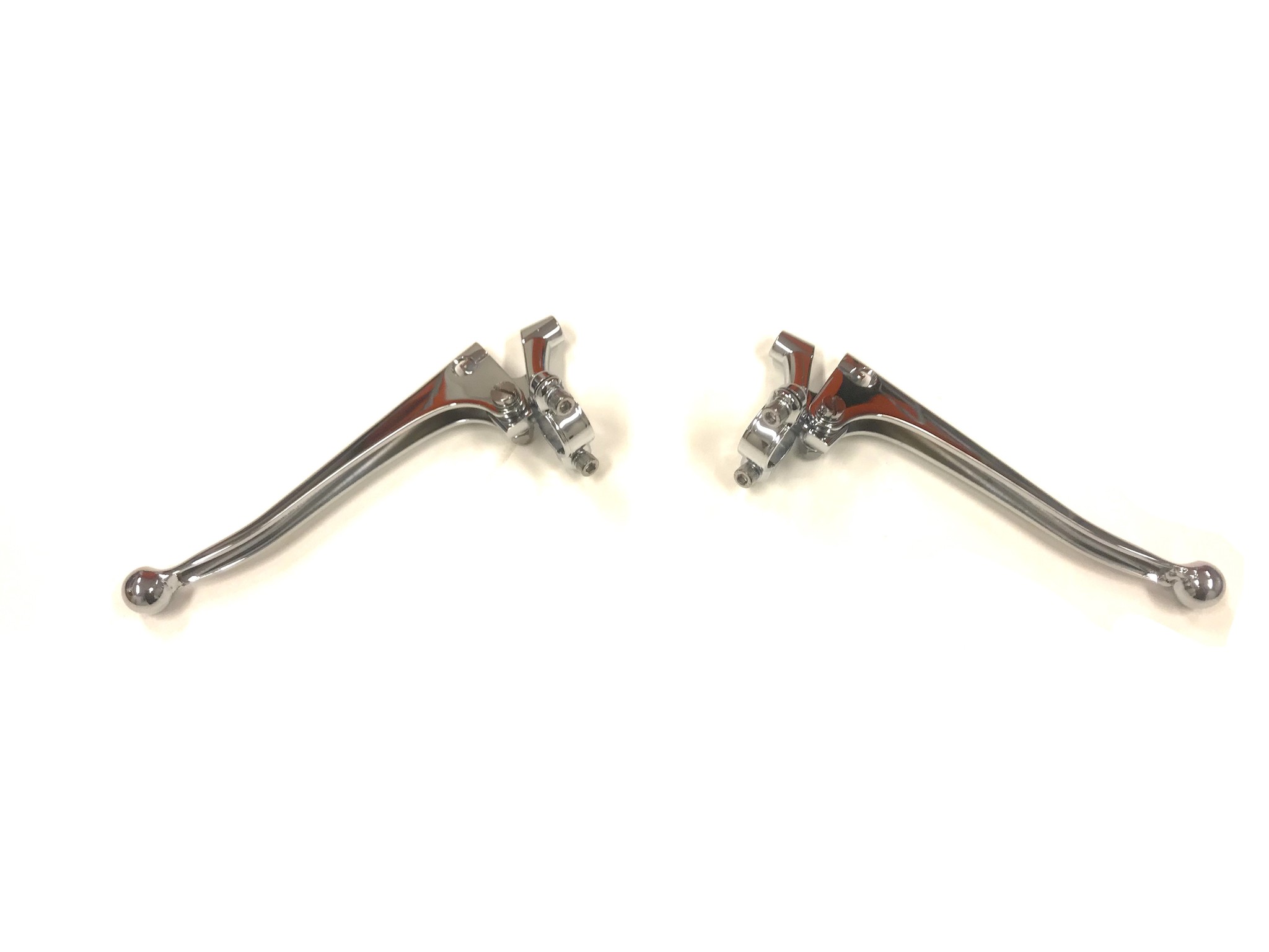 Boxed Pair oder 7/8 "Kugelhebel ohne Kabeleinsteller. (1-1 / 16" Drehpunkte) Hochwertige Chromplatte und Befestigungsschrauben. Passend für einige Norton und Velocettes.