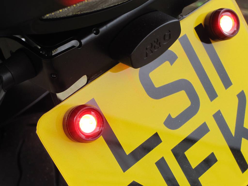 Paar LED - Rücklicht universal. Hochwertige 23mm Durchmesser mit einer roten LED - Leuchten, die in dem Nummernschild montiert werden kann und verdoppelt wie Schrauben, oder kann auf jeder ebenen Fläche als Schwanz sitzen oder Lichter zu stoppen.