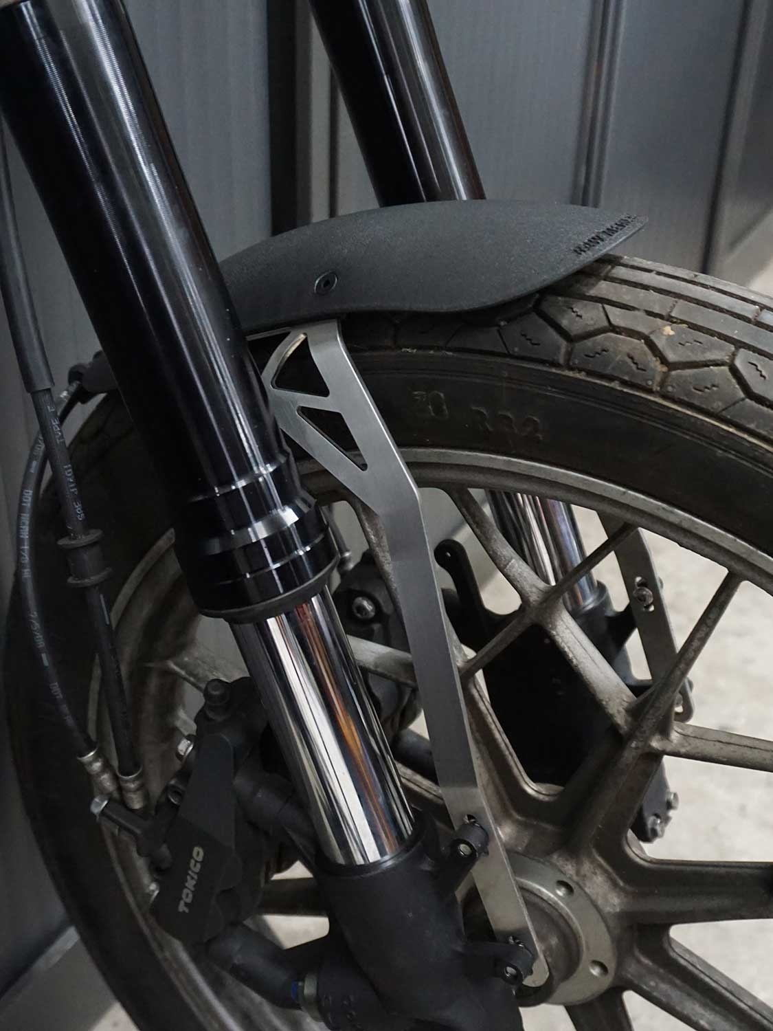 Diese wunderschön verarbeiteten vorderen Kotflügel sind speziell für Custombikes mit GSX-R-Gabelumbau gefertigt. Die schwarzen Kotflügel sind aufgrund der strukturierten Oberfläche sehr schön anzusehen. Die Halterungen bestehen aus 3 mm starkem Edelstahl und können auf Wunsch in Farbe lackiert werden. Da die Halterungen über ein Langloch verfügen, ist der Kotflügel höhenverstellbar.