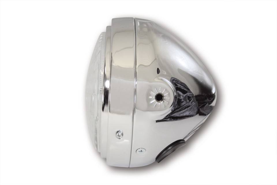 5 3/4-Zoll Verchromtes Cafe Racer Hauptscheinwerfer Standlicht Funktion und seitlichen Befestigungspunkten. H4-Hauptscheinwerfer in einem verchromten Metallgehäuse mit einstellbarem Innenring und geriffeltem Glas. Der Scheinwerfer verfügt über einen asymmetrischen - nur für den Rechtsverkehr zugelassenen - Reflektor und Standlicht, E-geprüft.