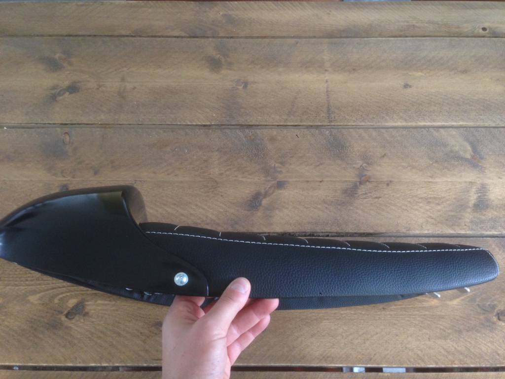 Coole Sitzbank für SR500 und SR400, wahlweise als Tracker oder Cafe Racer zu benutzen, da der Sitzbank eine Höcker beiliegt der bei bedarf einfach angeschraubt wird.Der Bezug ist aus schwarzen Kunstleder Quernaht.Einfach gegen die Originale auszutauschen da plug and play! Rahmen kann entsprechend gekürzt werden da die Sitzbank kürzer ist als Original, muß aber nicht. Somit kann eure Yamaha SR500 mit wenig aufwand in einen Cafe Racer oder Tracker verwandelt werden. Passende Schrauben für den Höcker liegen bei.
