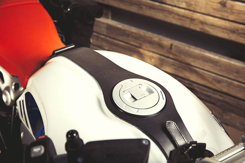 Tankgürtel aus Narbenleder und mit Nylonfaden genäht. Komplett mit Montagewinkeln. Handgefertigt in Italien. Verleiht dem Tank einen Vintage-Stil und ermöglicht die Montage unserer Handyhülle Cod. 1607 oder der Tankrucksack Cod. 122509_04