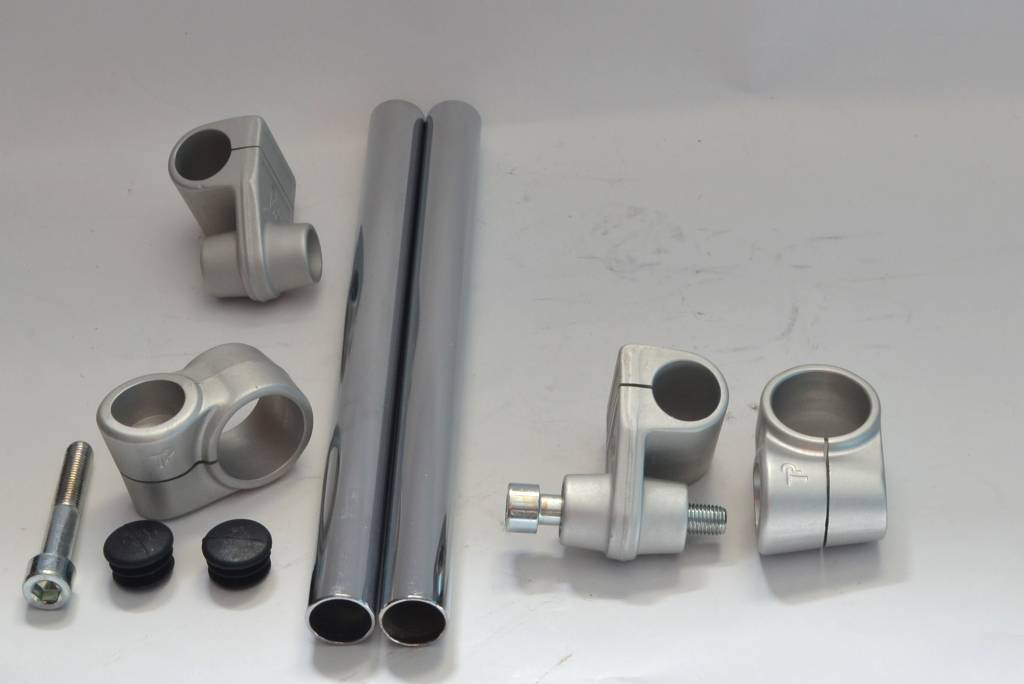 Verstellbare Clipons, Low Rise, von Paolo Tarozzi aus Bologna. Alu-Standrohrschelle und verchromter Stahl 22mm Lenker. "Bridging piece" hebt die Achse des Lenkers um ca. 40mm im Vergleich zu den Tarozzi race type clipons. Stufenlos in allen Ebenen einstellbar, bedeutet das, dass man, wenn man sich nicht an die Passform gewöhnt, wie Quasimodos kleiner Bruder gebaut werden muss.
