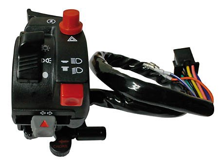 Uni-Lenkerschalter Honda mit Chokehebel, links, Funktionen: Licht an/Standl./aus, auf/ab, Blinker, Kill, Horn, Warnblinkschalter mit Gummitülle. Wie 102-0599, jedoch mit Chokehebel. Breite: 45 mm. Für den Starter sind zwei Kabel herausgeführt. Somit ist der Schalter für Plus- oder Masse geschaltete Anlasser geeignet. Der Artikel verfügt über einen Starterknopf, aber NICHT über einen Killschalter.