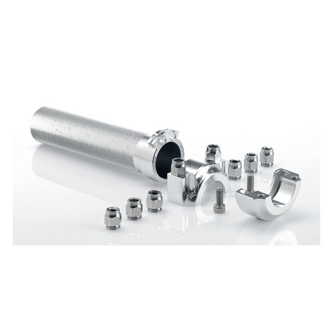 Für "1" Lenker. CNC-gefräste Drosselhülse aus Aluminium mit Feinguss-Aluminium-Klemme. Inkl. zwei Sätze mit vier Kabelschuhen für universelle und serienmäßige 74-95-Schrauben, 81-95-Schrauben & 96-up-Sicherungsring-Design HD-Anwendungen und kundenspezifische Kabel in einem Einzel- oder Doppelkabel-Setup in Kombination mit einem Lenker mit einem Durchmesser von "1". Nimmt serienmäßige HD-Gasgriffe.