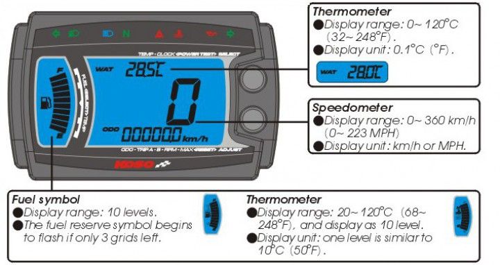 Geschwindigkeit, Drehzahl, Wassertemperatur, Öltempemperatur, Tankwarnung. Lieferung inklusive Universalsensor und Haltesatz und ausführlicher englischer Anleitung.