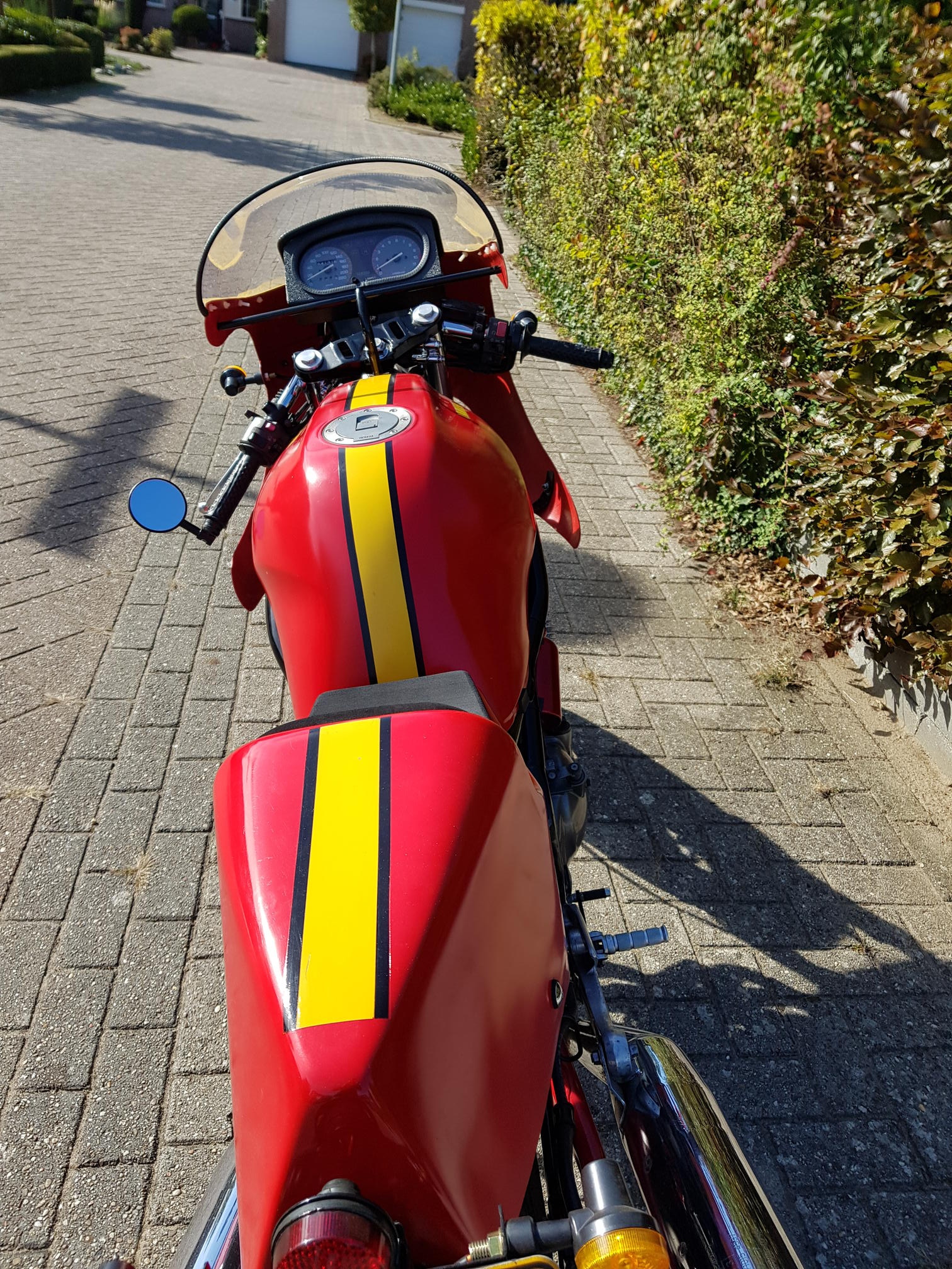 Das Motorrad ist mit einem Yamaha TZ-Rennsitz in der oberen Hälfte ausgestattet, Clip-Ons, die Auspuffanlagen sind noch original.