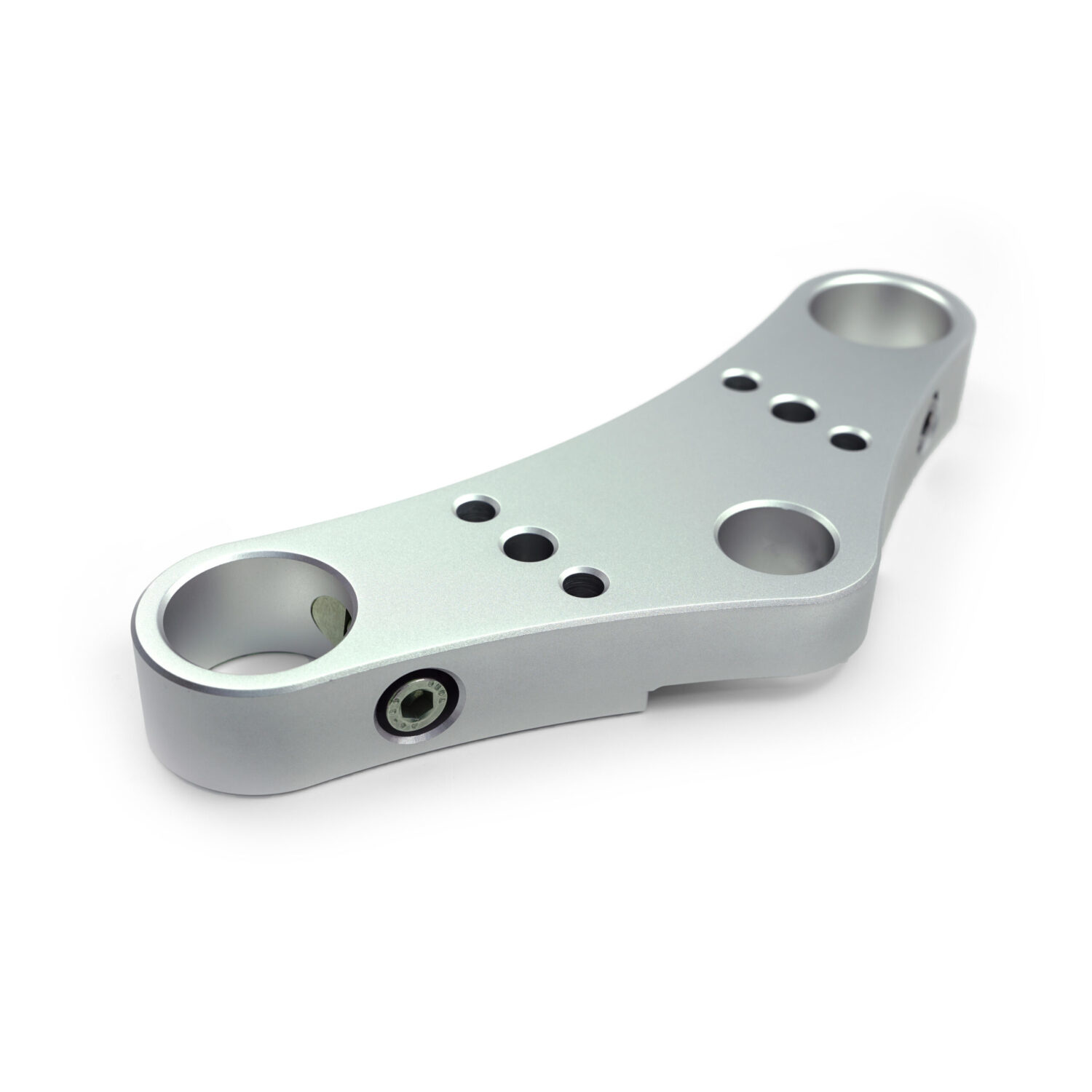 Diese hochwertige Gabelbrücke ist aus einem Stück hochwertigem Aluminium CNC-gefräst. Nach der Bearbeitung durchläuft die Gabelbrücke eine Reihe von Oberflächenbehandlungsschritten, einschließlich Eloxieren. Das Ergebnis ist ein glattes Satin-Finish, das sowohl kratz- als auch witterungsbeständig ist. Vervollkommnen Sie für einen Caférennfahrer-Motorradbau oder irgendeinen anderen kundenspezifischen Bau, in dem Sie Klipp-auf verwenden möchten.