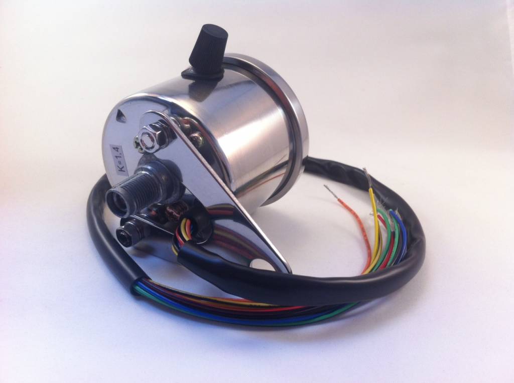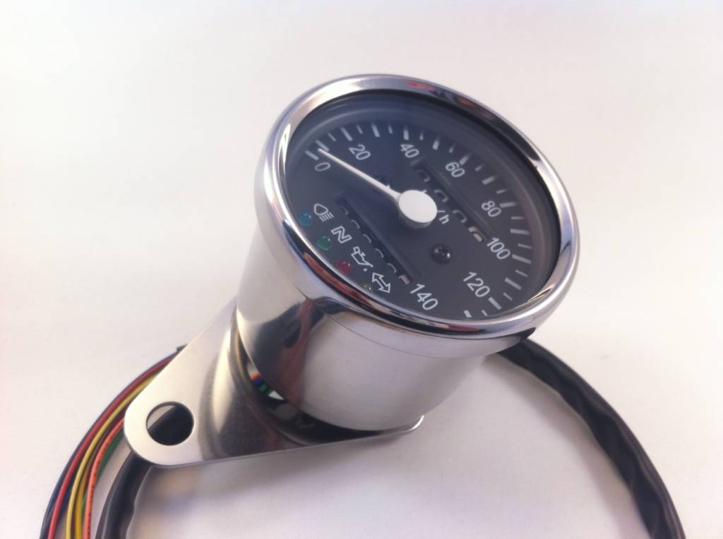 Stainless steel Cafe Racer Speedometer, white illuminating, black dial, D= 60 mm, 60 km/h = 1.400 rpm (K=1,4), 4 indicator lights.