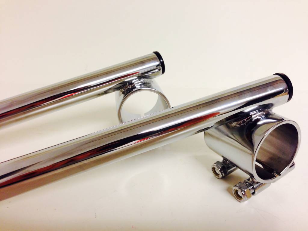 Pair of Universal 33 mm (1-5/16") Clip-on Handlebars. Can be fitted on almost any motorcycle with 33 mm fork tubes and 7/8" controls. Chrome-plated steel.
