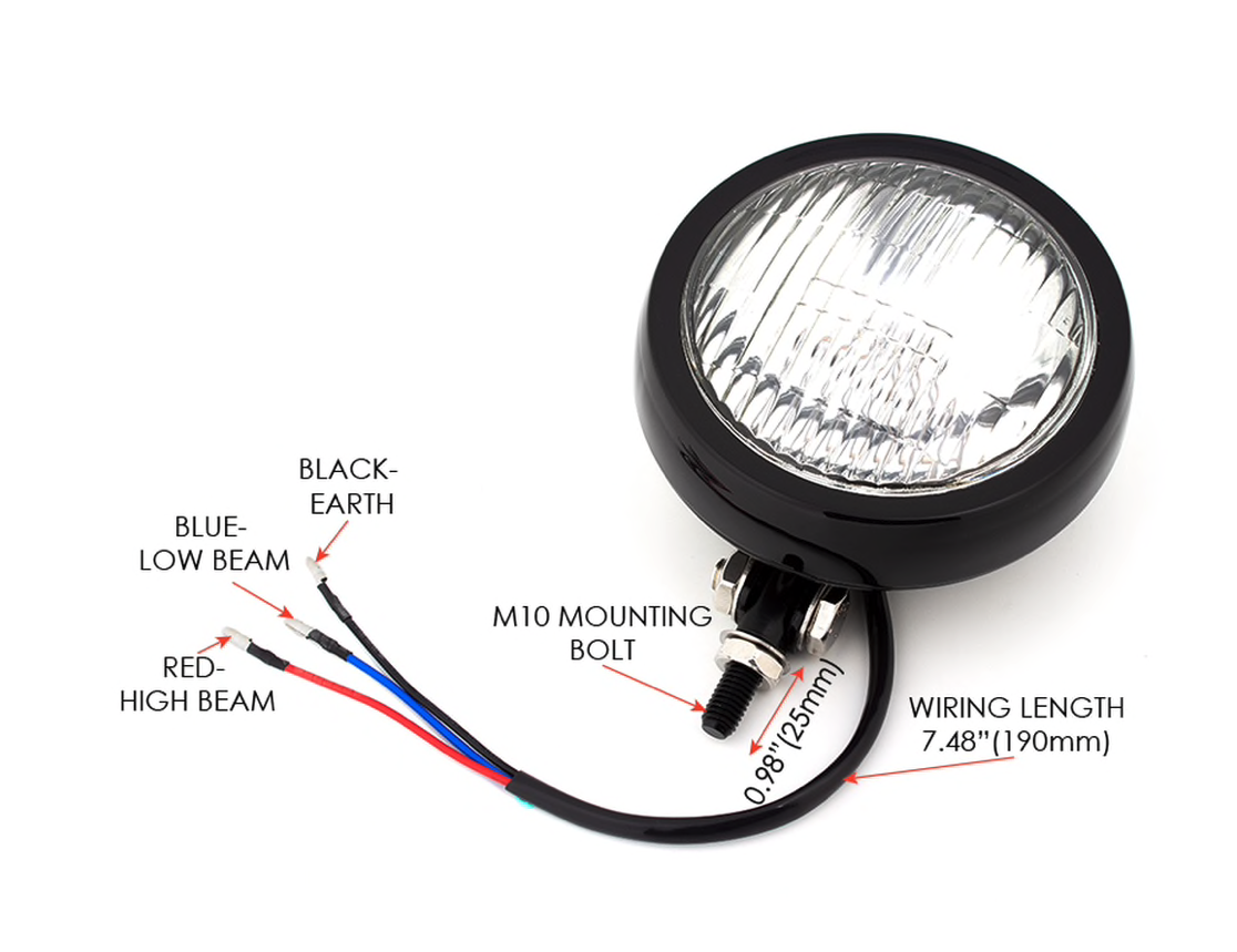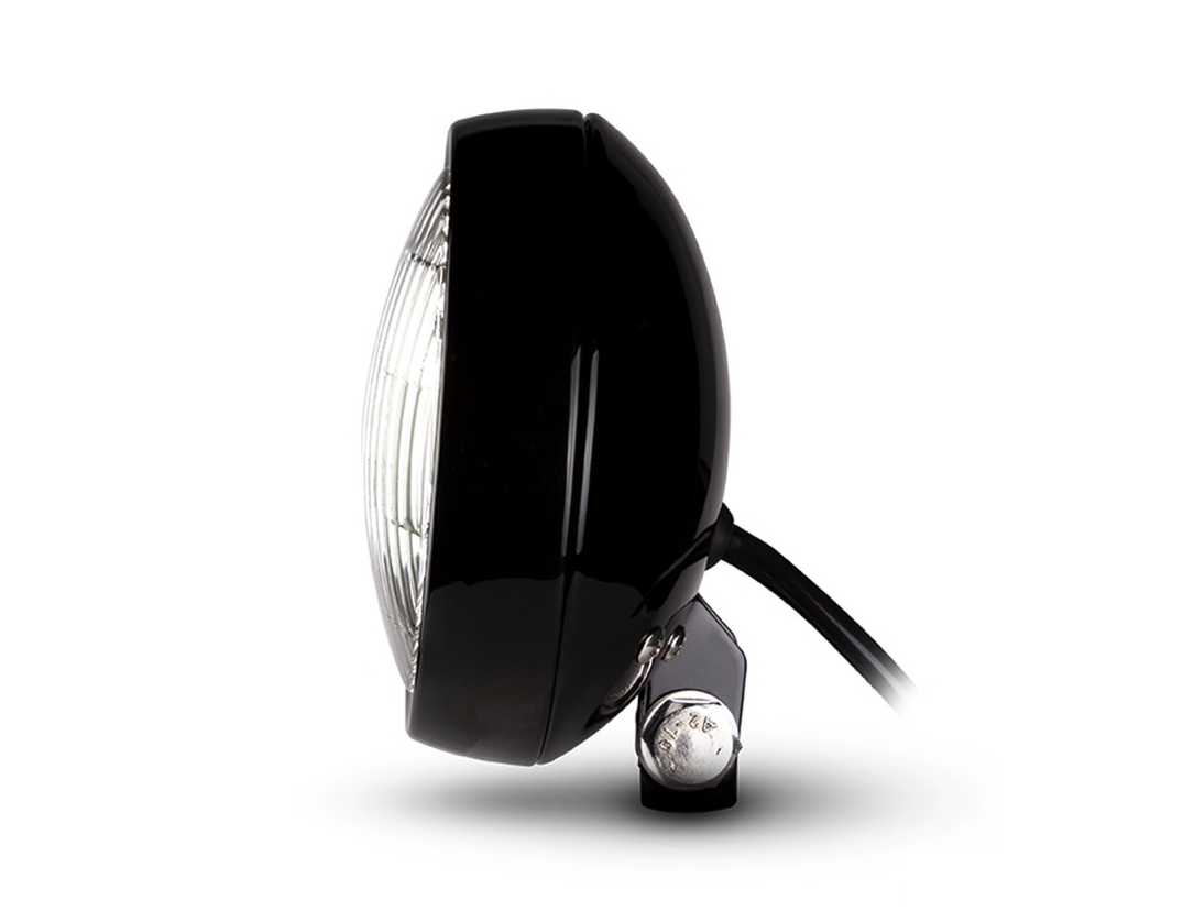 This is a solid little custom headlight with a bottom mounting bracket. The housing is shallow which allows you to mount the headlight close to your frame.