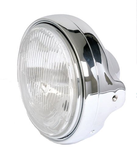 7" Chrome Cafe Racer Universal Headlight, chrome metal housing for side mounting, H4 insert with parking light!