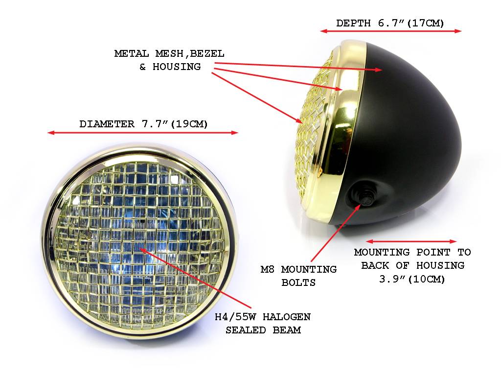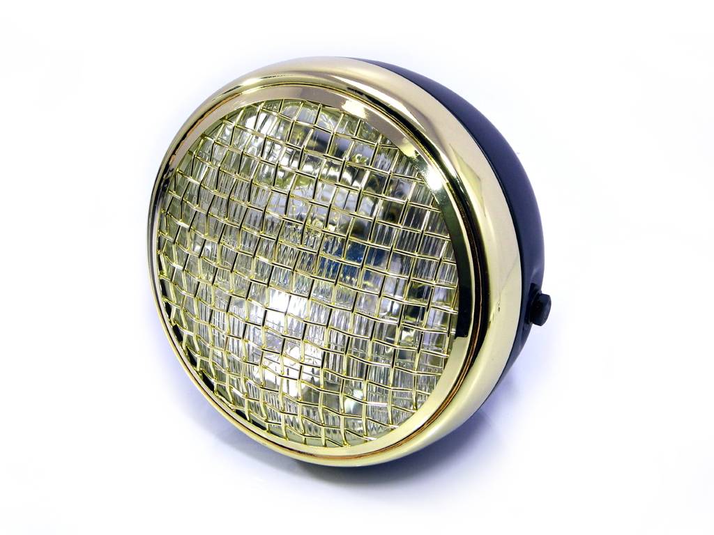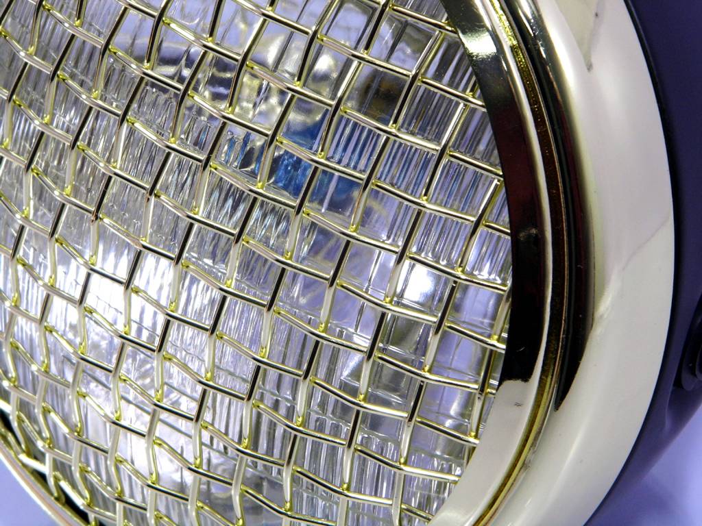 This is a stunning classic style headlight. It features a very cool brass mesh grid & rim and has a steel body. The beam is sealed and its bucket is deep enough to house a fair amount of wiring.