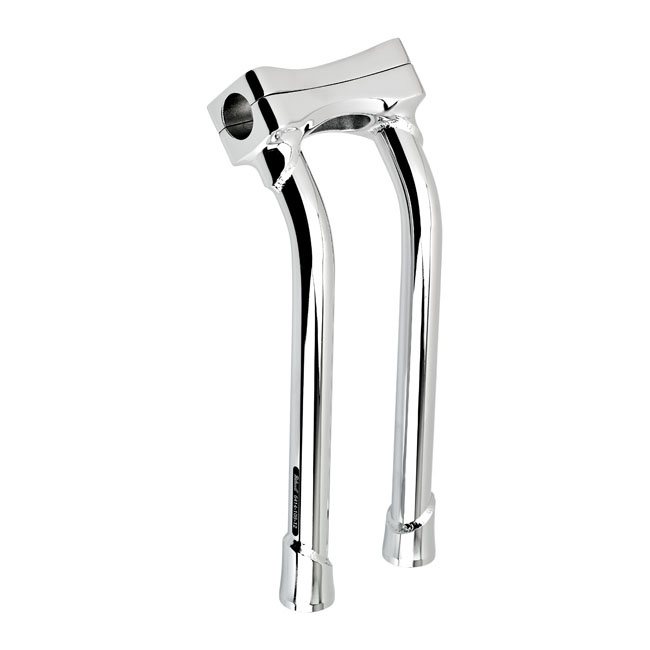 It has electroplated finishes in black or chrome and comes with approval. It is suitable for 1-1/8 (28.6mm) handlebars. It comes with 2"(51mm) Pullback, investment-cast steel upper and threaded lower construction. Riser tubes are made of 3mm thick, seamless, TIG-welded 4130 chromoly tubing with 1/2-13 threaded mounting holes that accept standard riser bolts. 3-1/2" (89mm) spacing to suit most H-D top triple trees. The stock H-D speedo and tachometer brackets fit the top clamp bolt pattern. The specific type of approval and validity for the bike model and years listed on the test report should be confirmed with your neighbourhood MCS dealer or the MCS sales department.