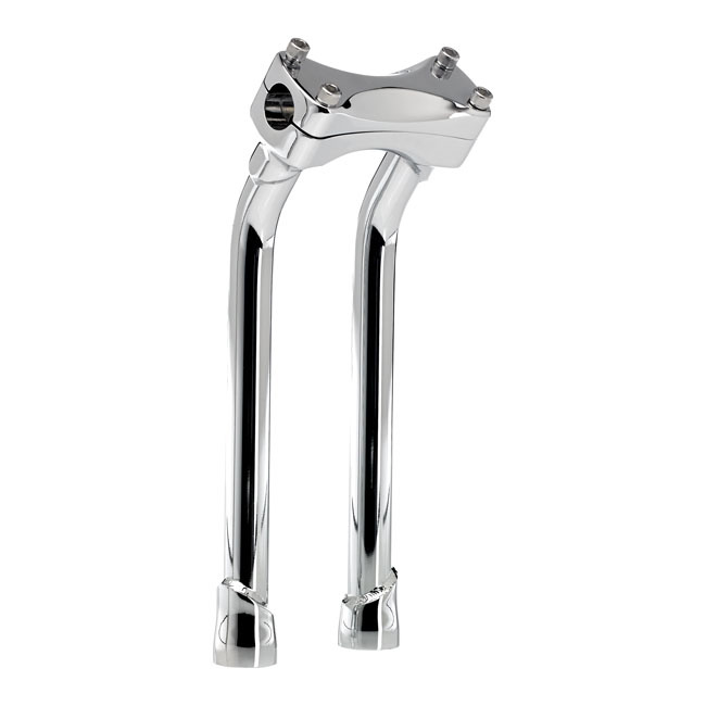 • Riser tubes are made of 3mm thick, seamless, TIG-welded 4130 chromoly tubing with 1/2-13 threaded mounting holes that accept standard riser bolts. 3-1/2" (89mm) spacing to suit most H-D top triple trees.