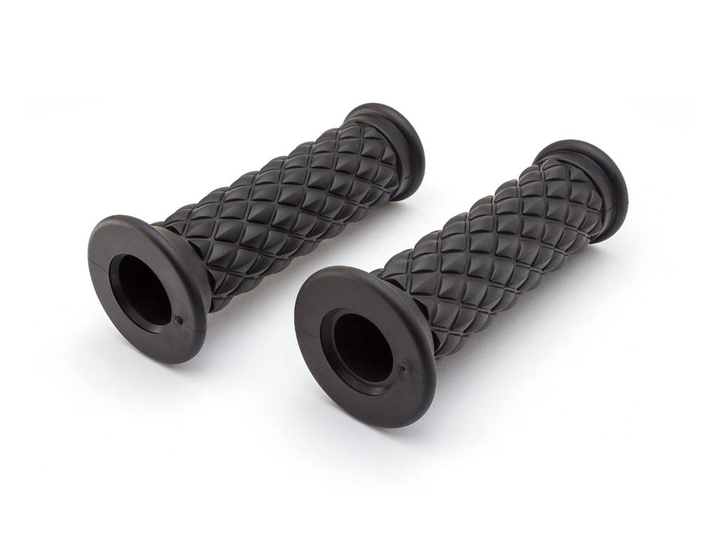 DIAMOND-STYLE SOFT GRIPS. These classic universal grips are comfortable and durable. They have an open end to allow the mounting of bar ends. Perfect for Custom Bikes, Scramblers, Cafe Racers, etc.