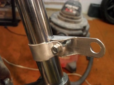 - Clamp the bracket to the fork tube with a clamp and force the long end around the tube by hand until the mounting tab comes all the way around