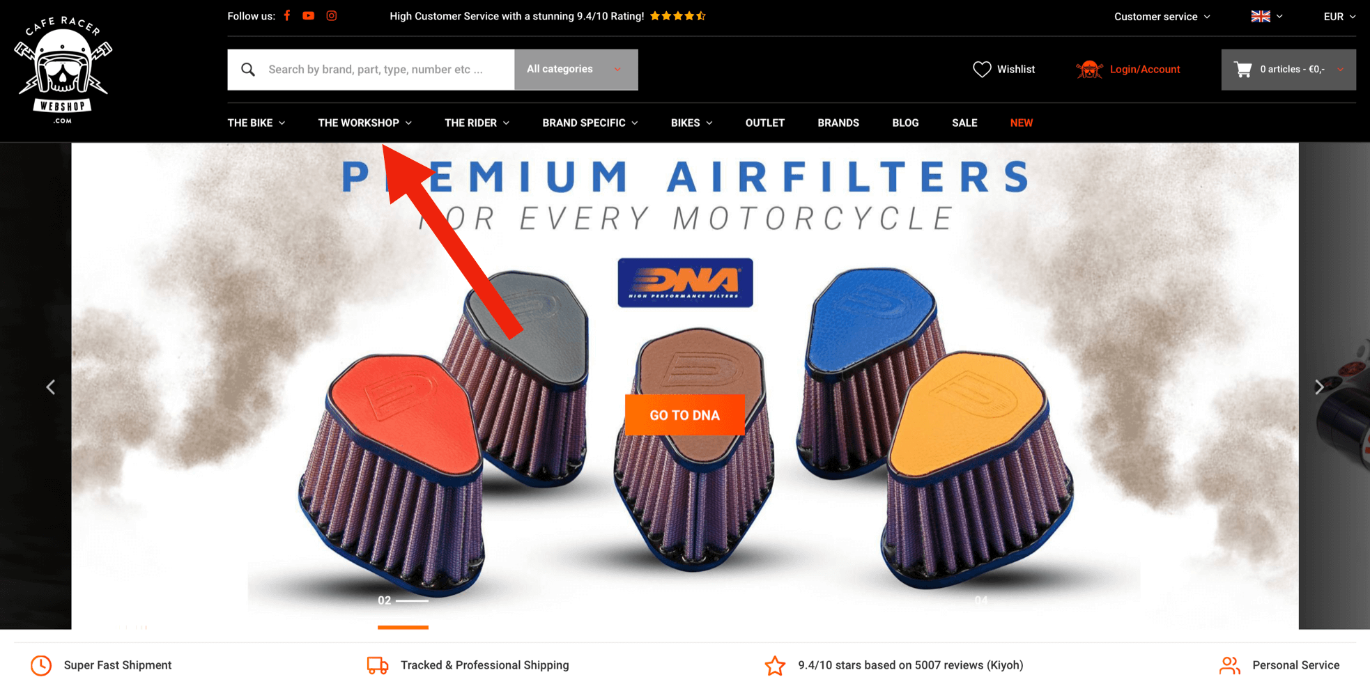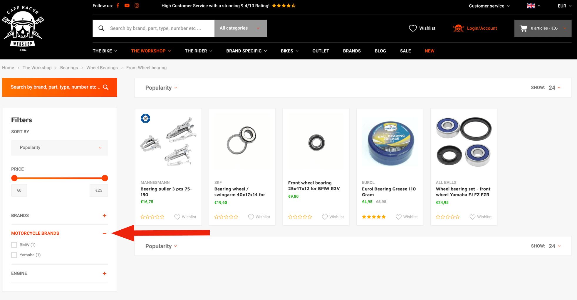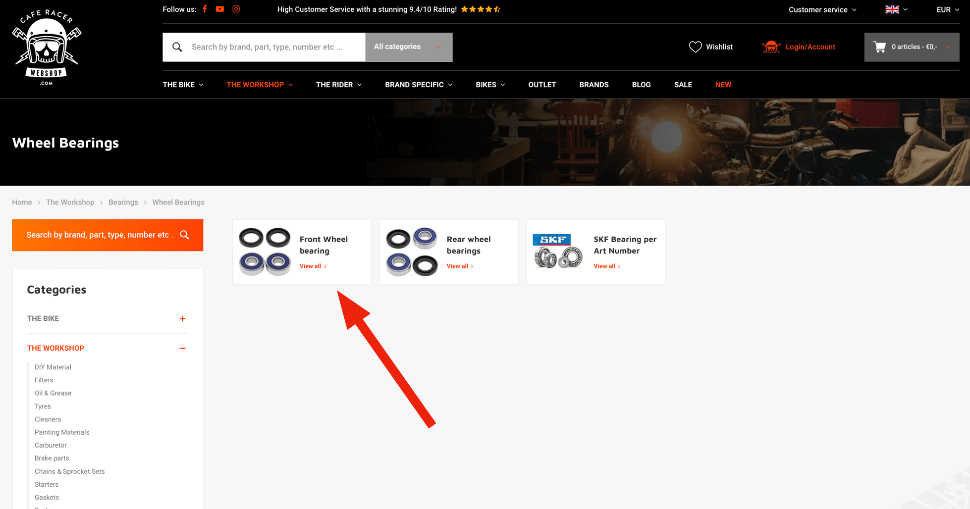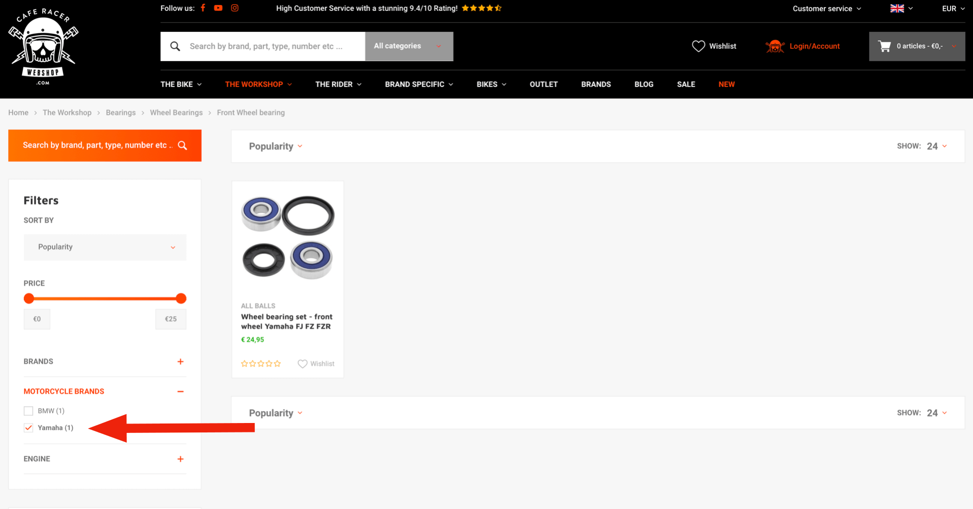 For example, we need some front wheel bearing for our Yamaha. When you are in the 'the workshop' category menu, you can search for the category you need. In this case the 'Bearings' category.